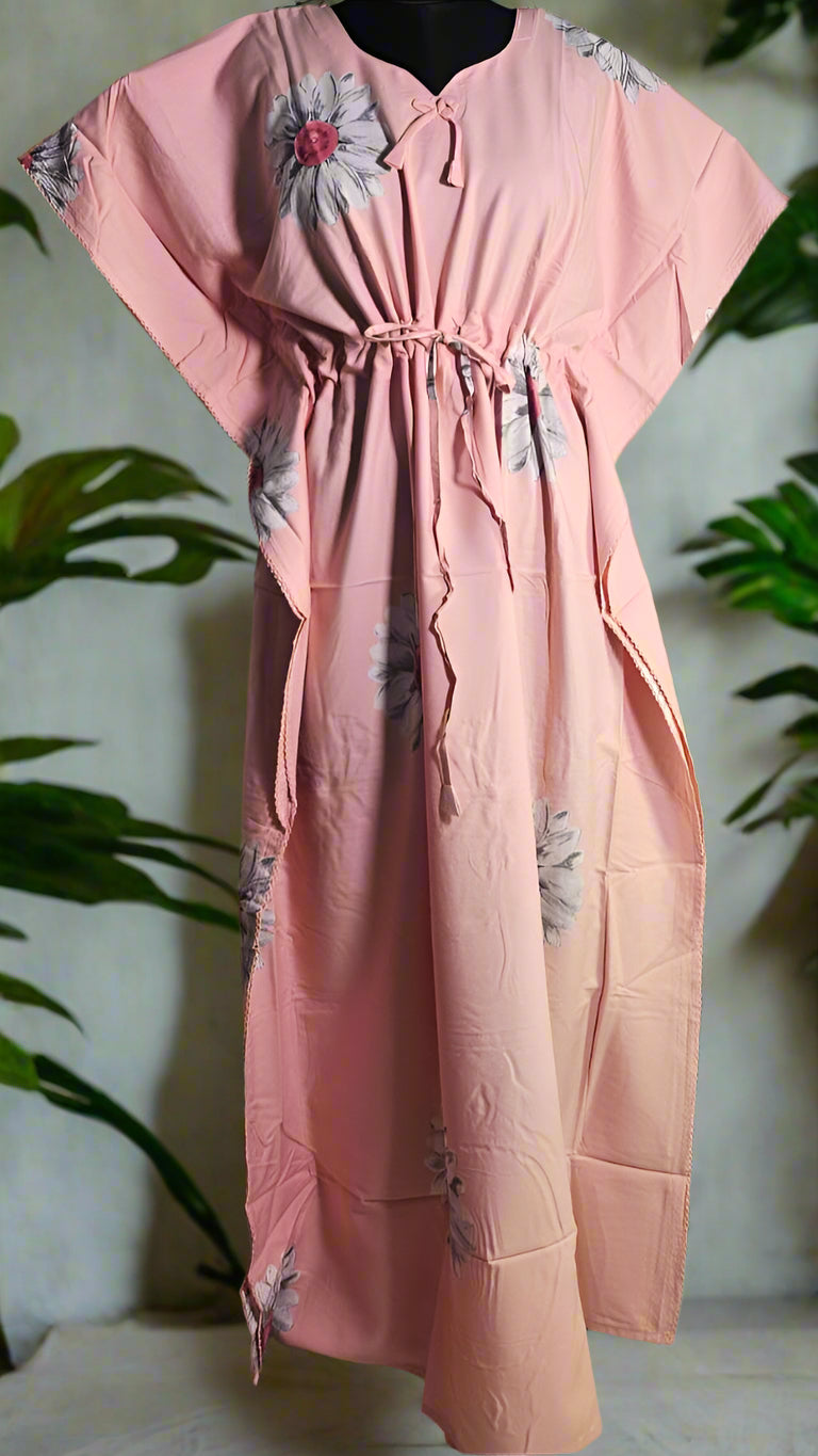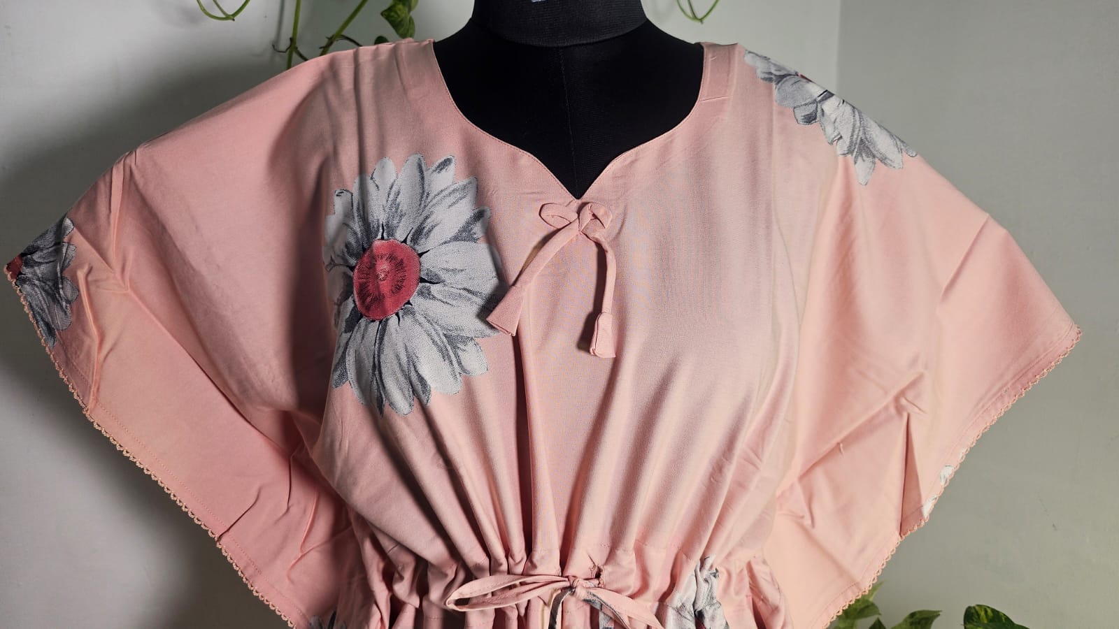 ऑफ-व्हाइट आर्किड किस के साथ मैजेंटा पुष्प प्रिंट फ्रिल्ड नाइटी।