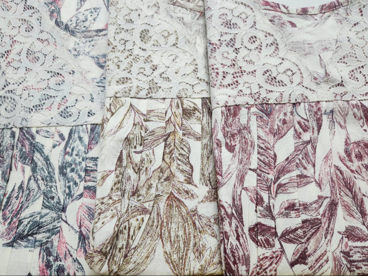डिजाइन: ऑर्किड किस मैजेंटा पुष्प प्रिंट के साथ ऑफ-व्हाइट, फ्रिल्स के साथ बिना आस्तीन।