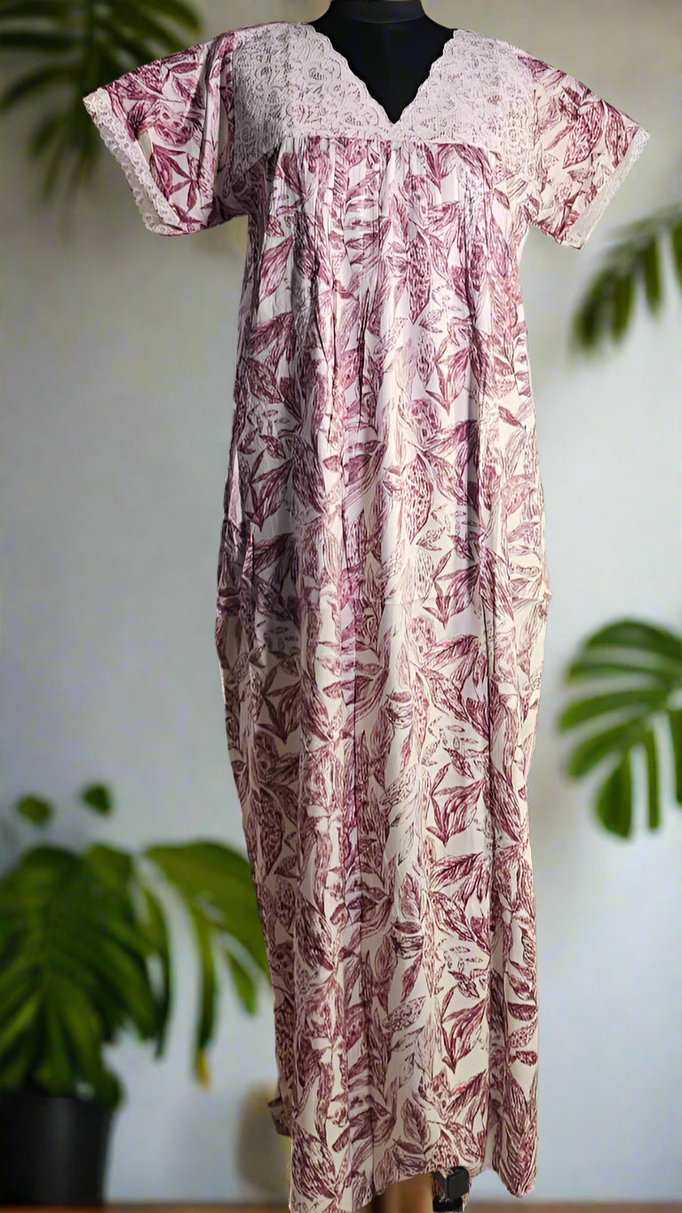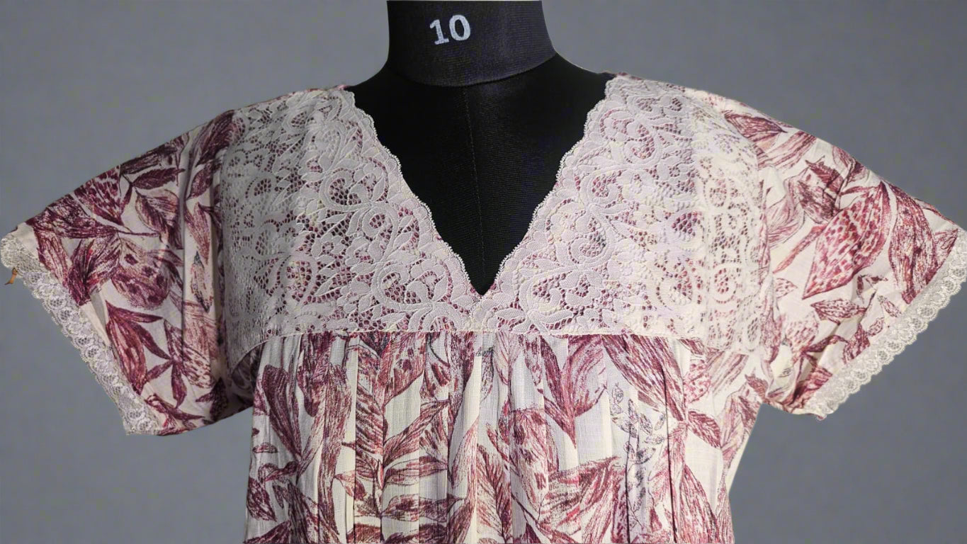 ऑफ-व्हाइट आर्किड किस के साथ मैजेंटा पुष्प प्रिंट फ्रिल्ड नाइटी।