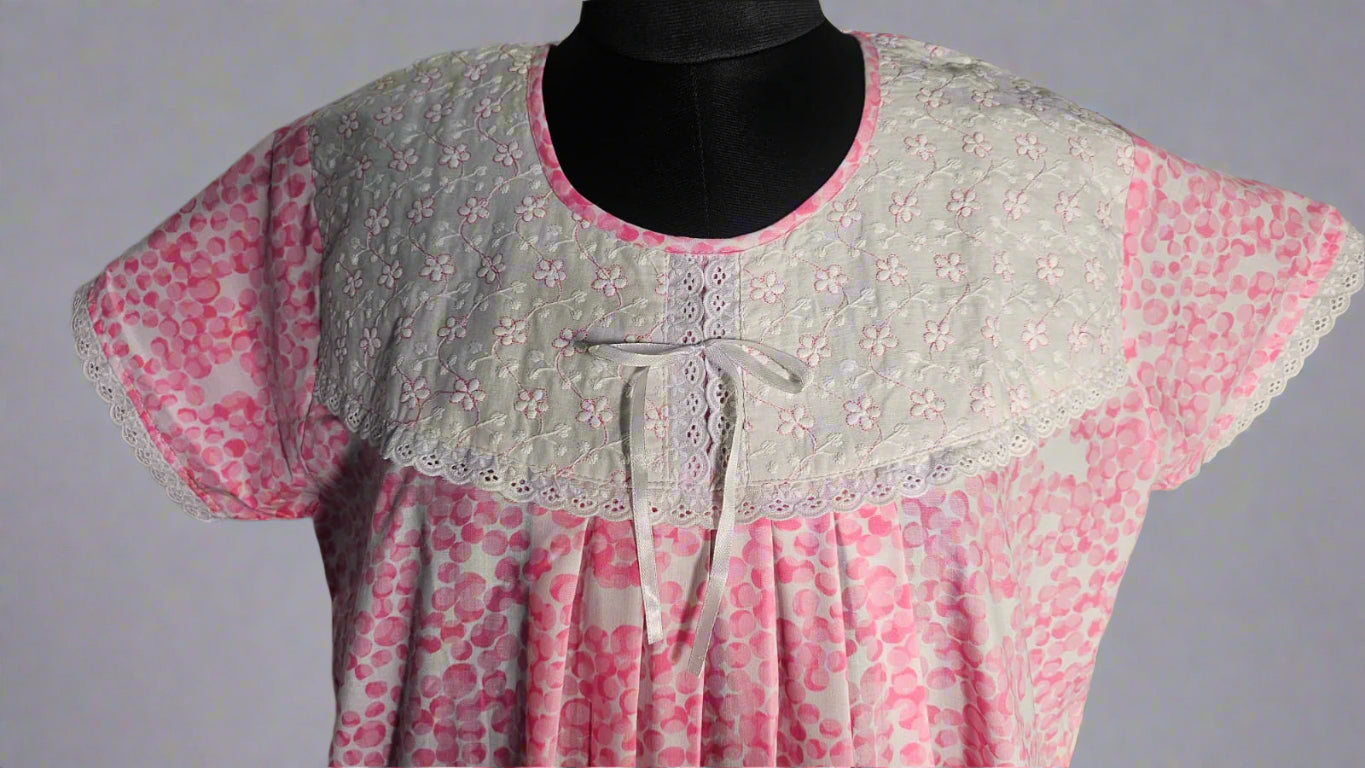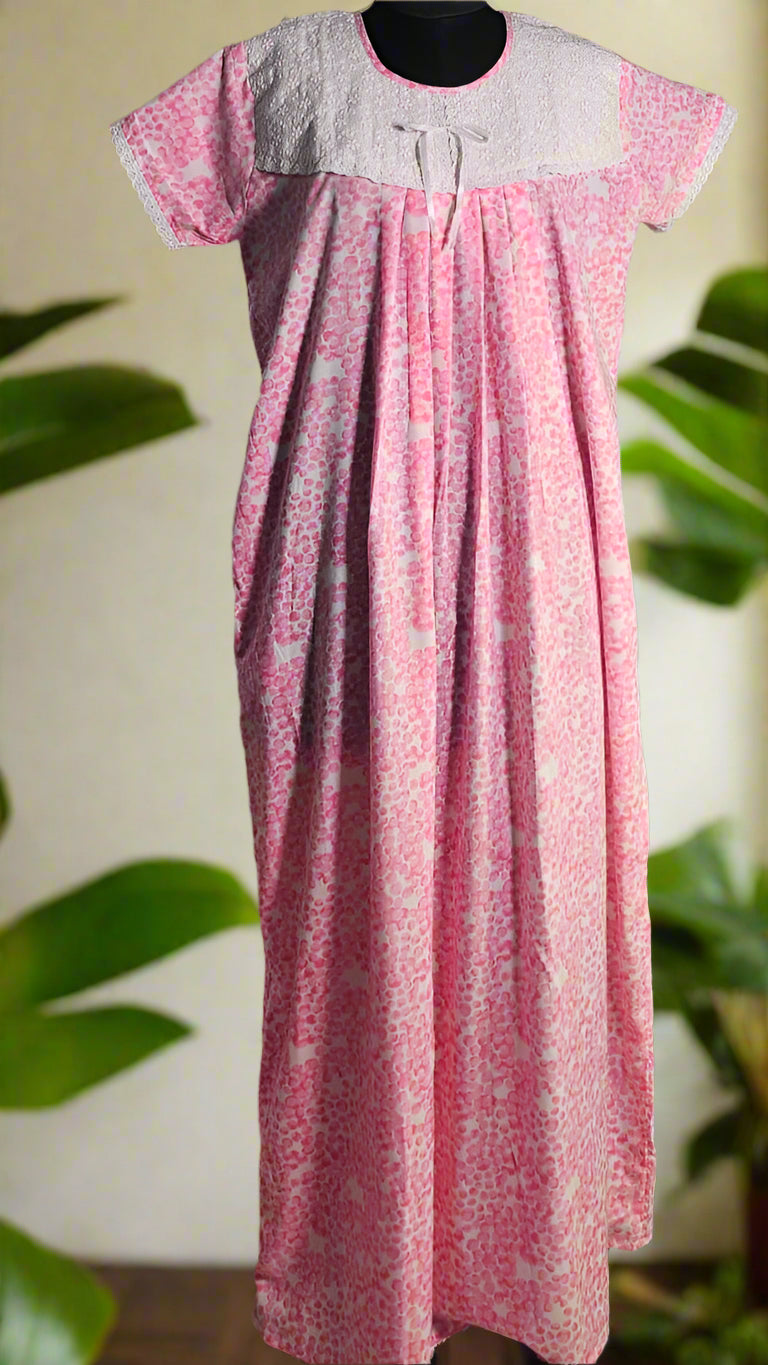 ऑफ-व्हाइट आर्किड किस के साथ मैजेंटा पुष्प प्रिंट फ्रिल्ड नाइटी।