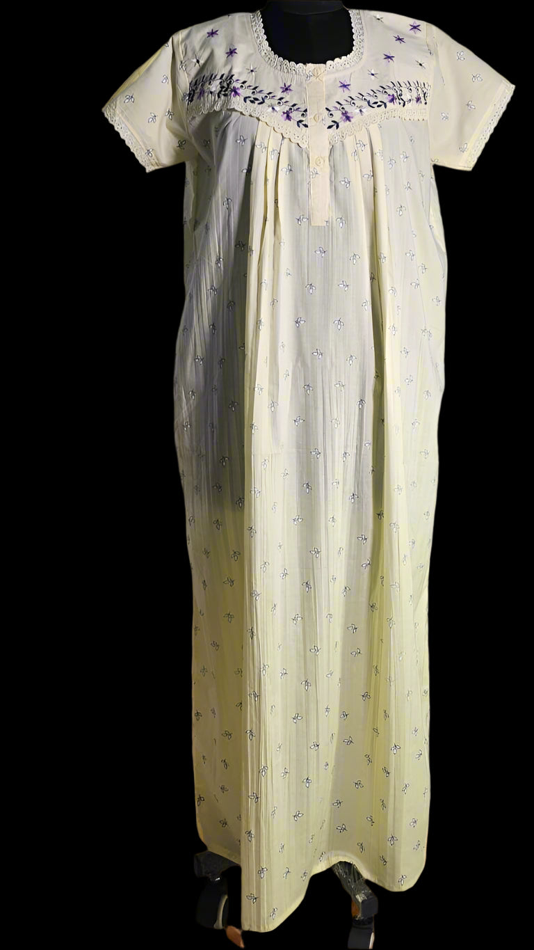 ऑफ-व्हाइट आर्किड किस के साथ मैजेंटा पुष्प प्रिंट फ्रिल्ड नाइटी।