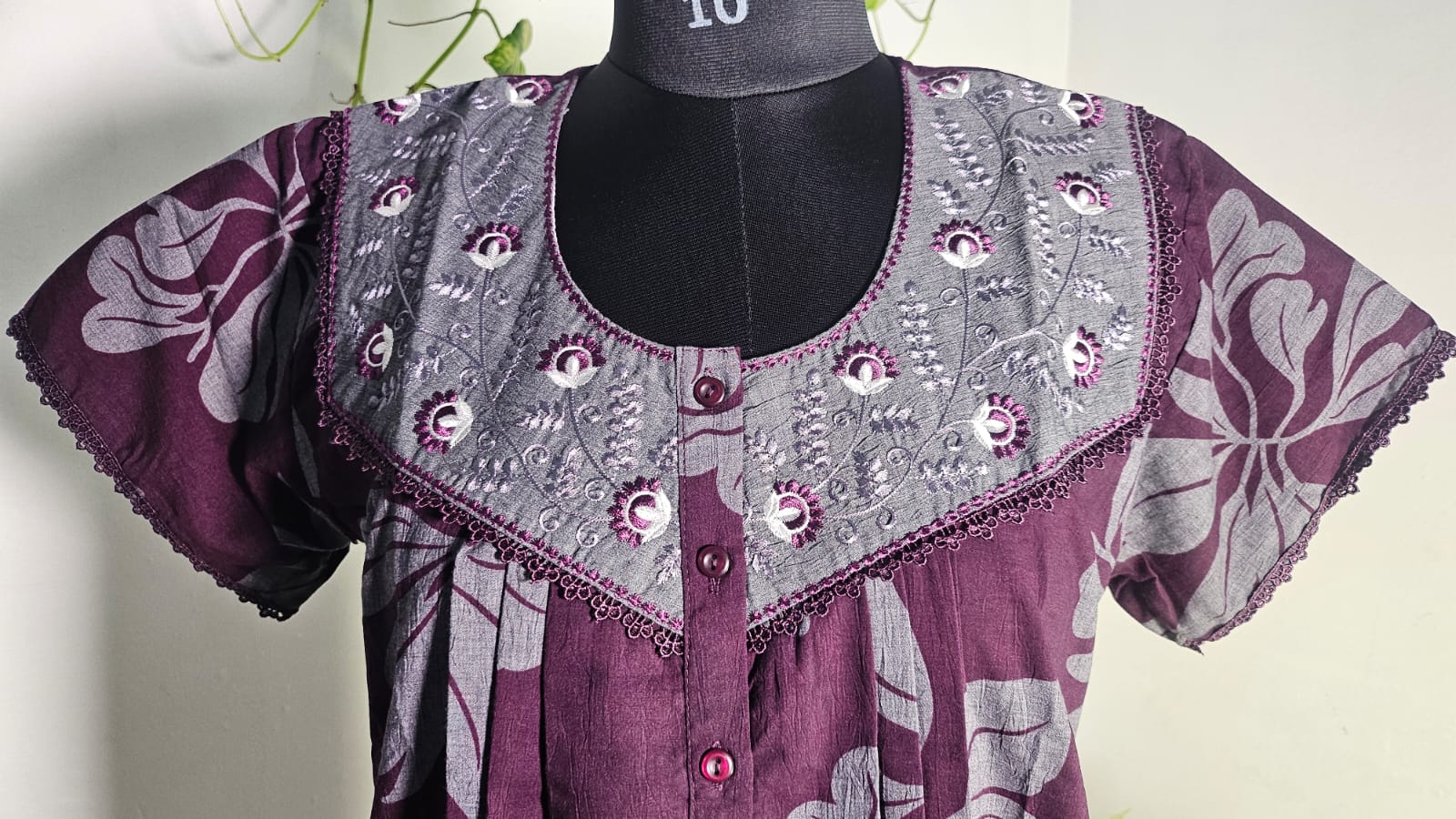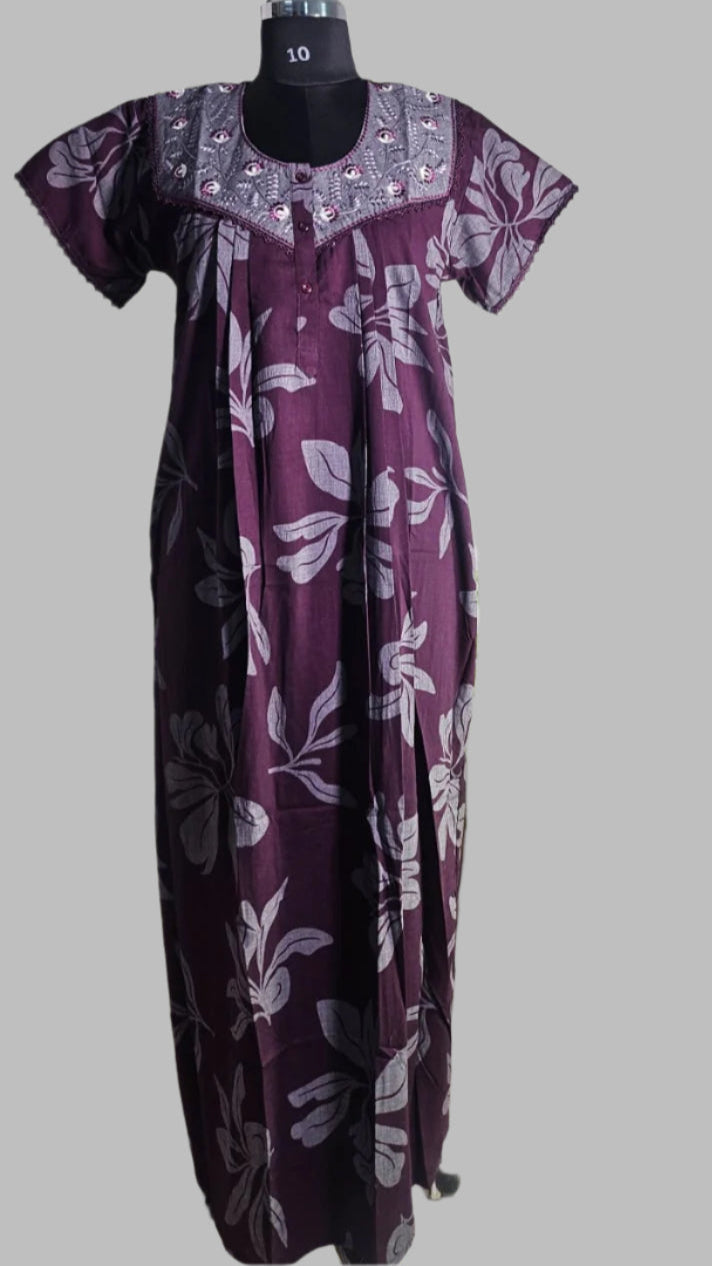 ऑफ-व्हाइट आर्किड किस के साथ मैजेंटा पुष्प प्रिंट फ्रिल्ड नाइटी।