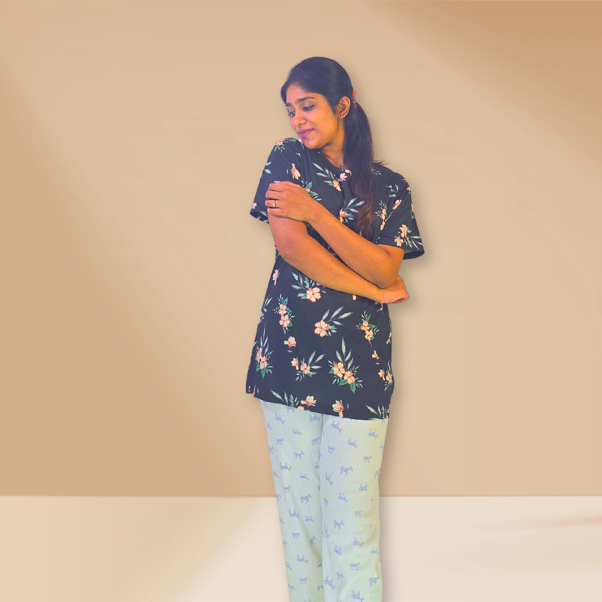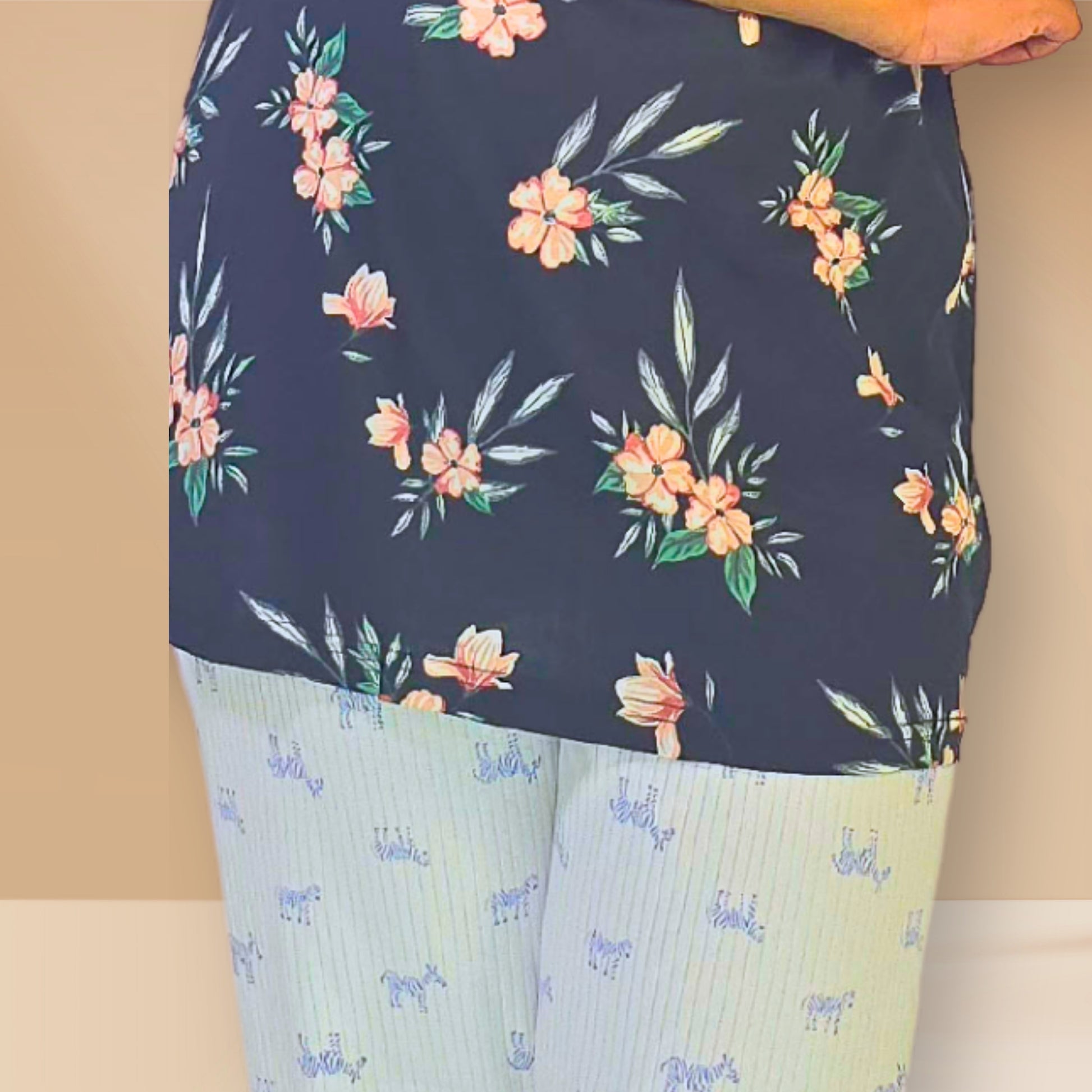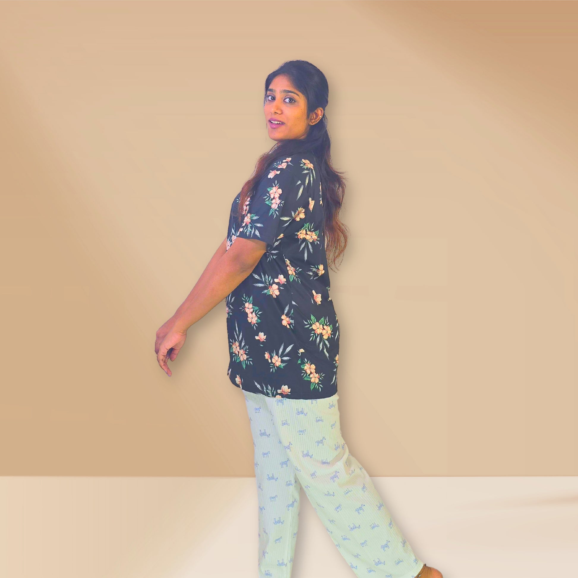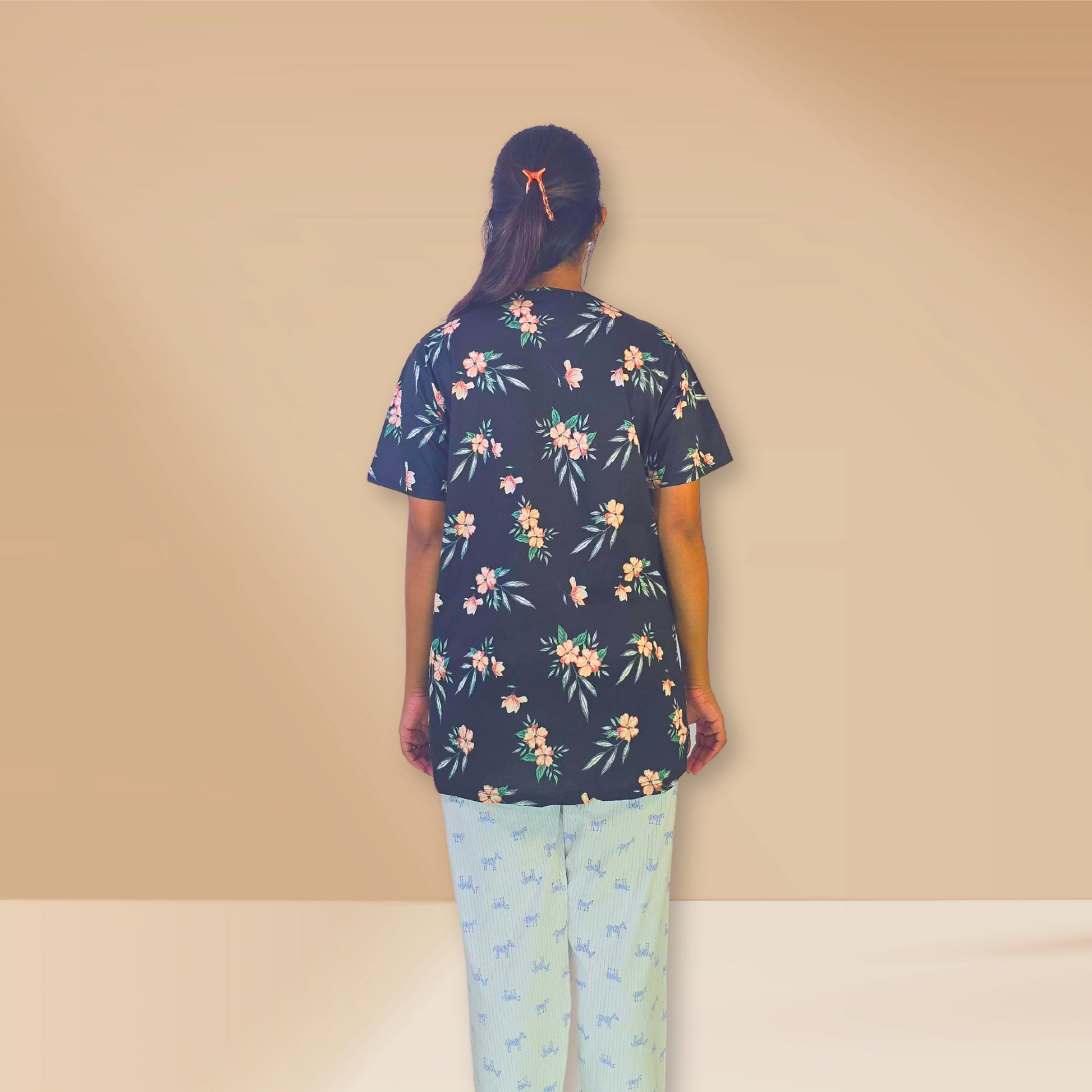 काले और सफेद पुष्प और जिराफ़ प्रिंट के साथ M&M नाइट ड्रेस