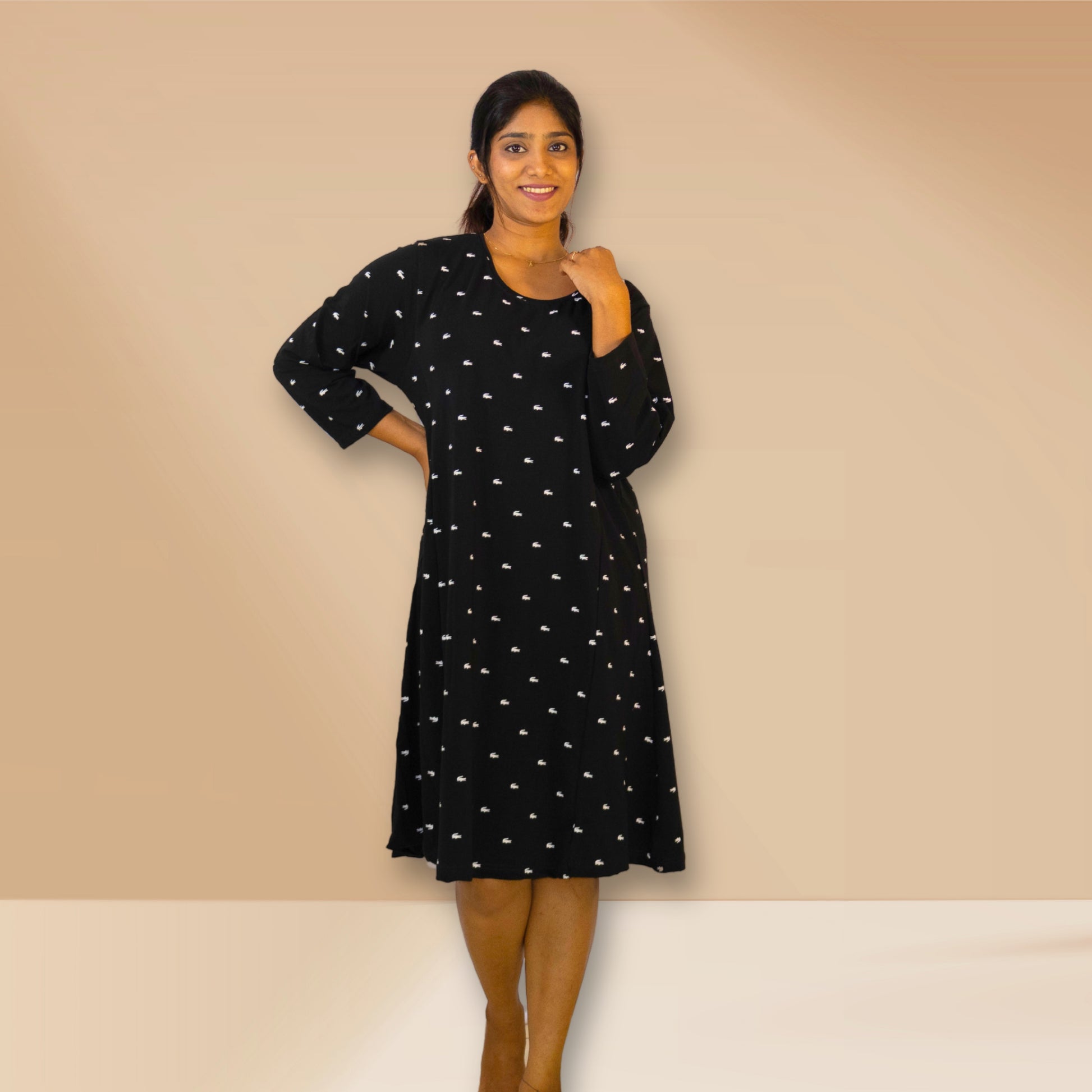 मगरमच्छ प्रिंट के साथ काले रंग की नाइटी।