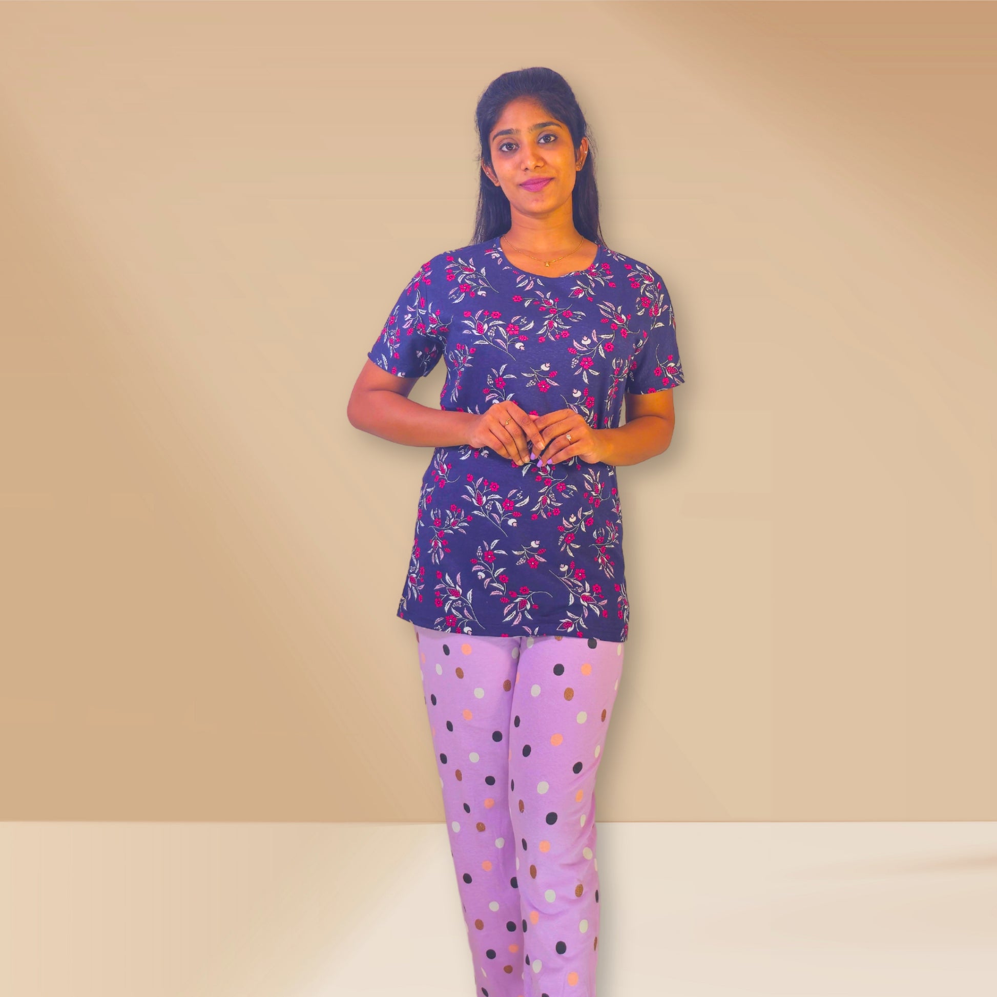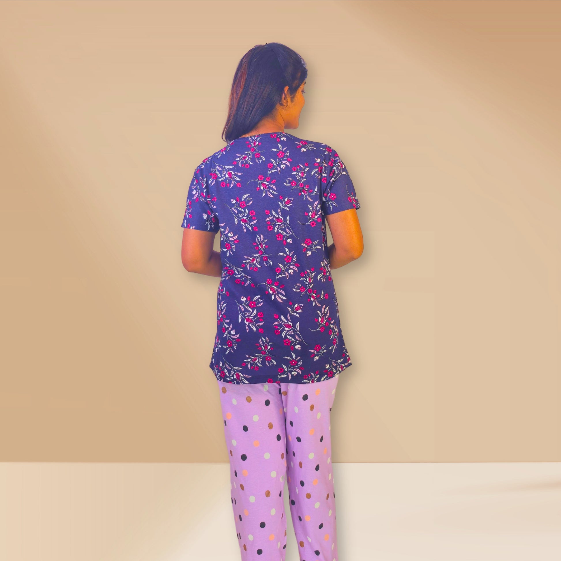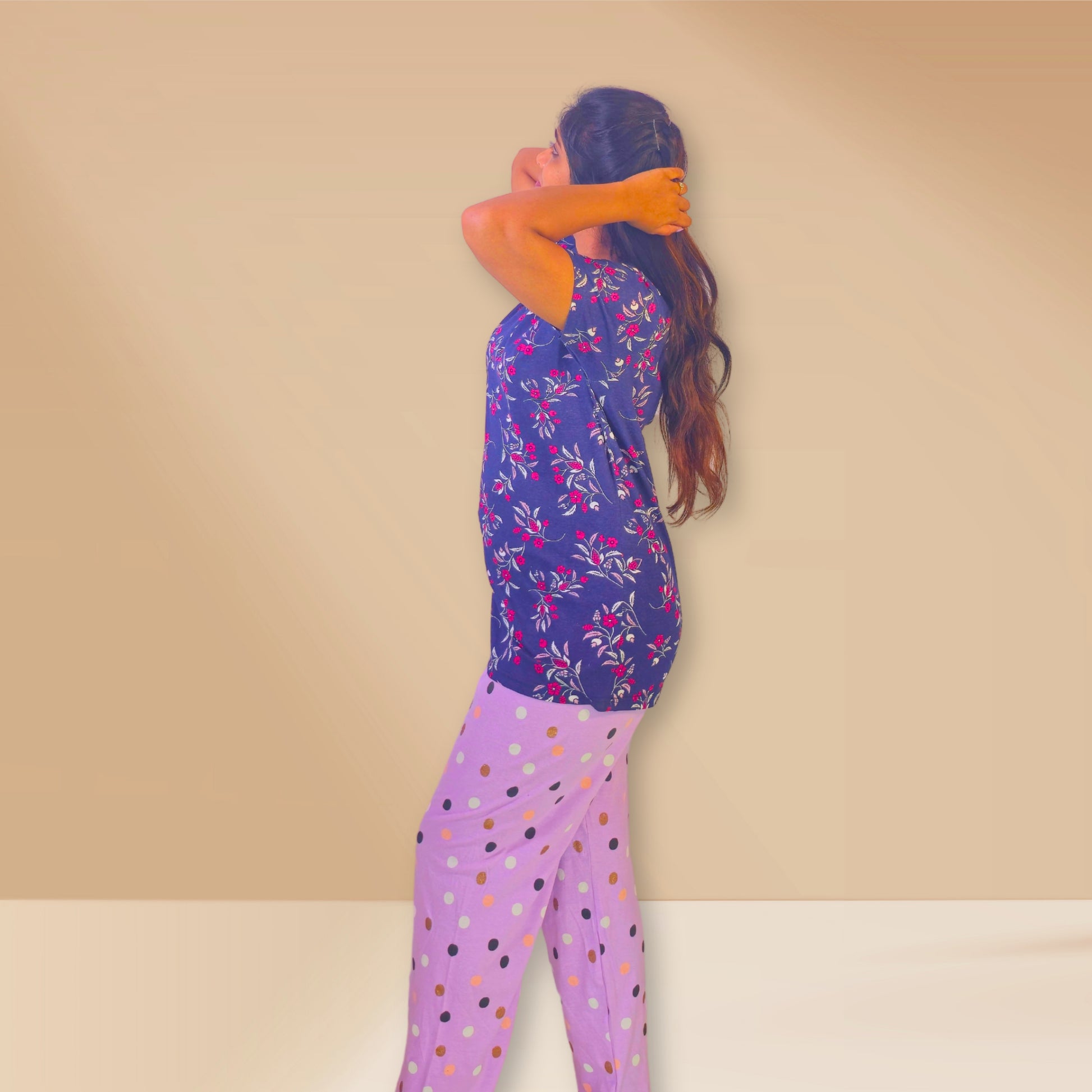 नीले और लैवेंडर गुलाबी रंग के साथ पुष्प और पोल्का प्रिंट