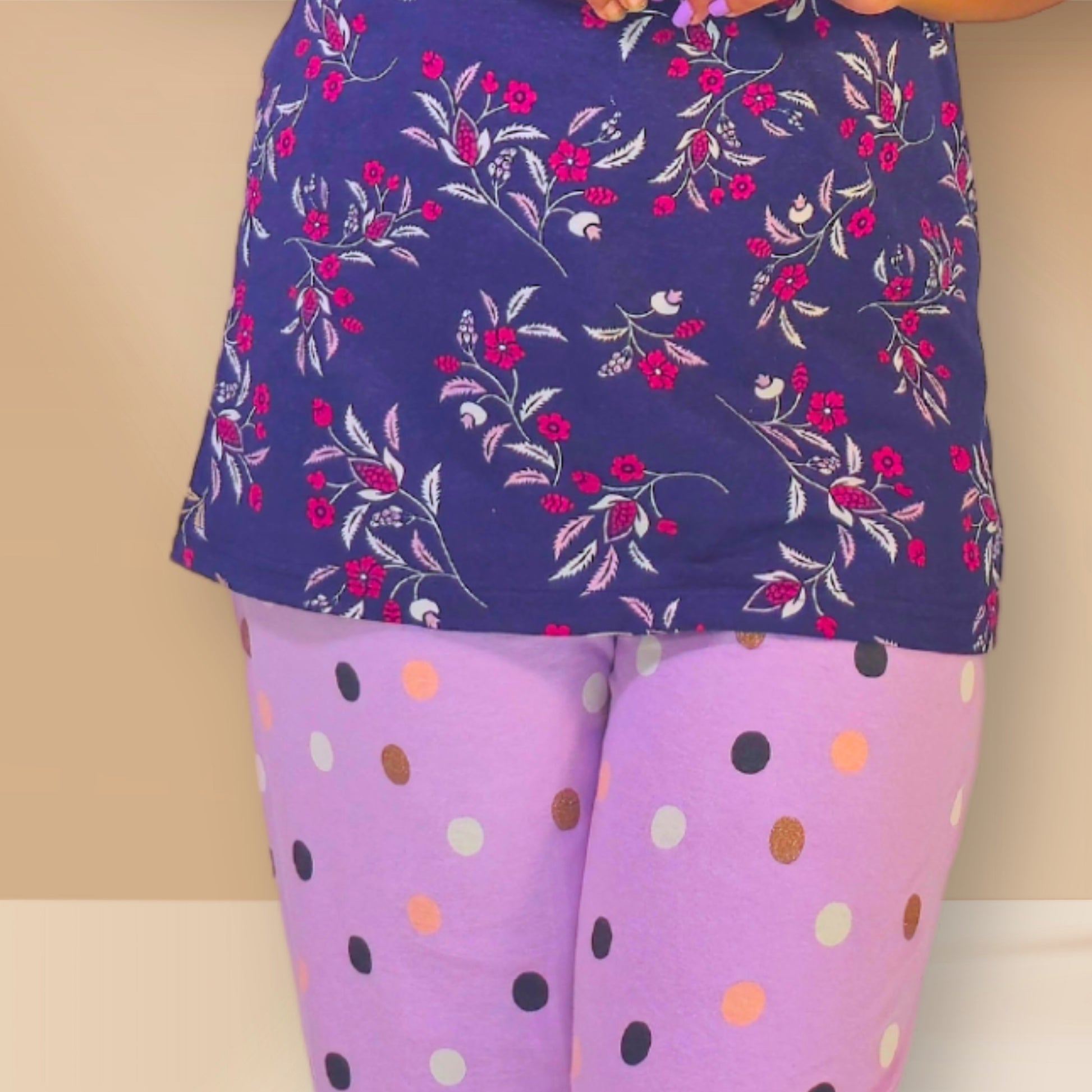 बॉटम: मल्टी कलर पोल्का प्रिंट के साथ एंकल लेंथ लैवेंडर पिंक।