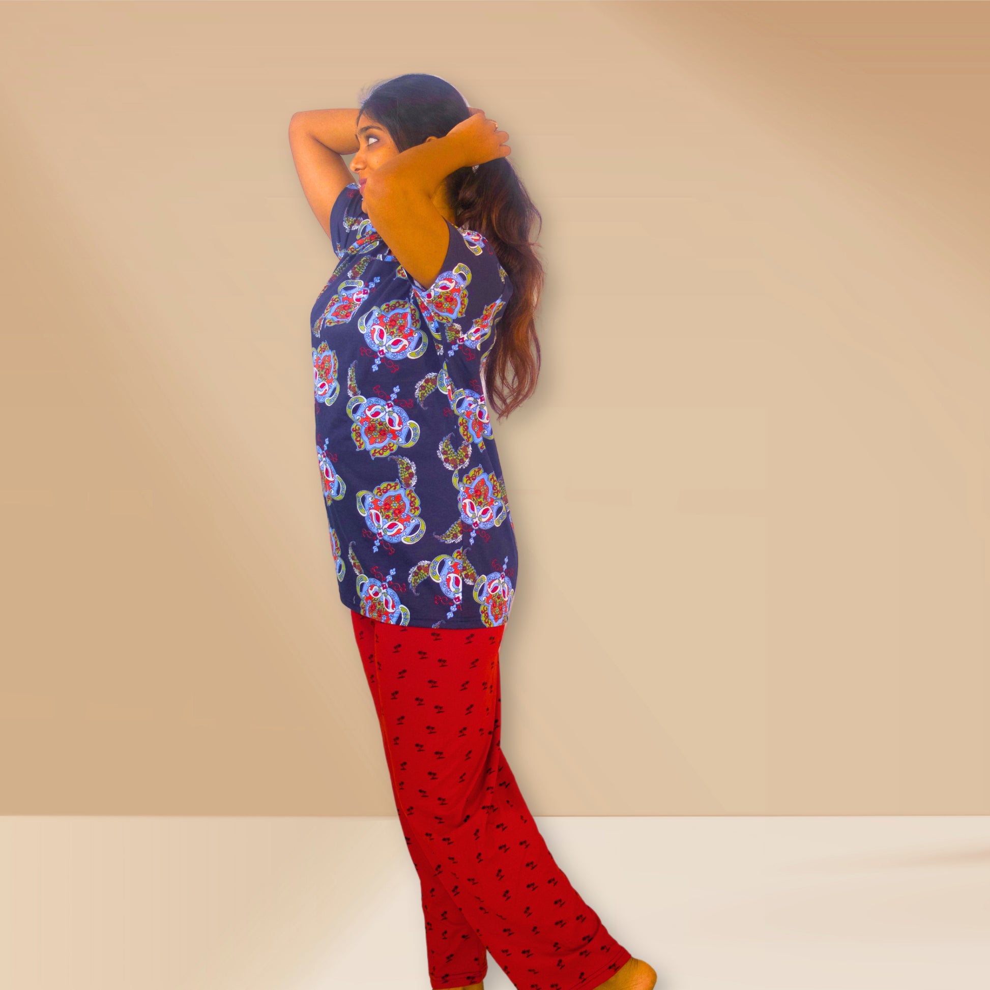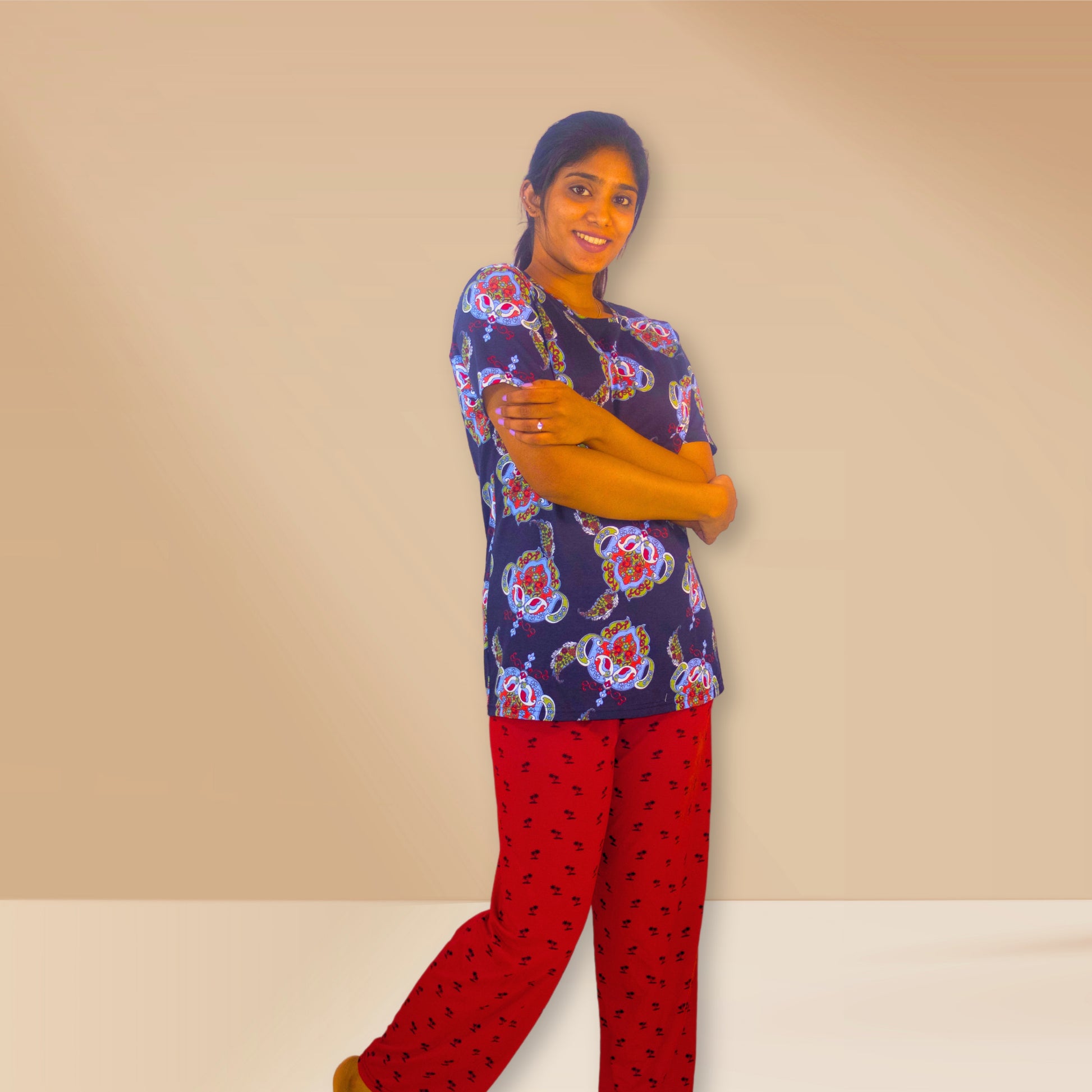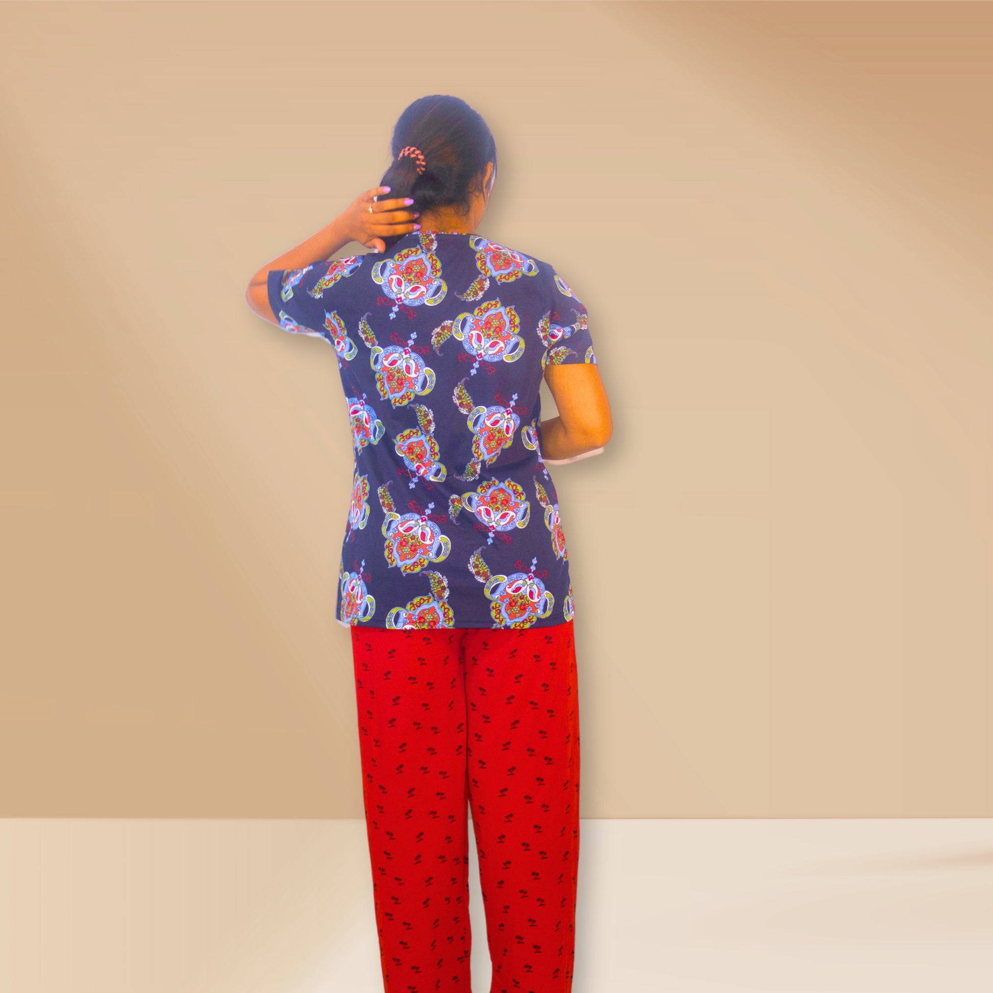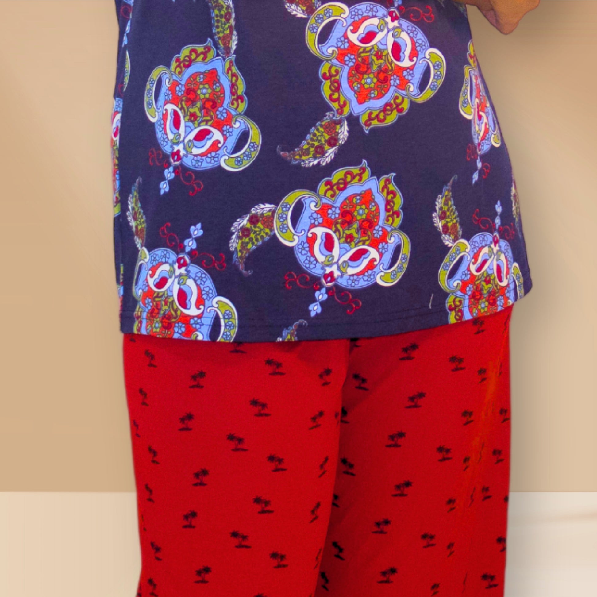 नीला और लाल, अमूर्त प्रिंट के साथ।