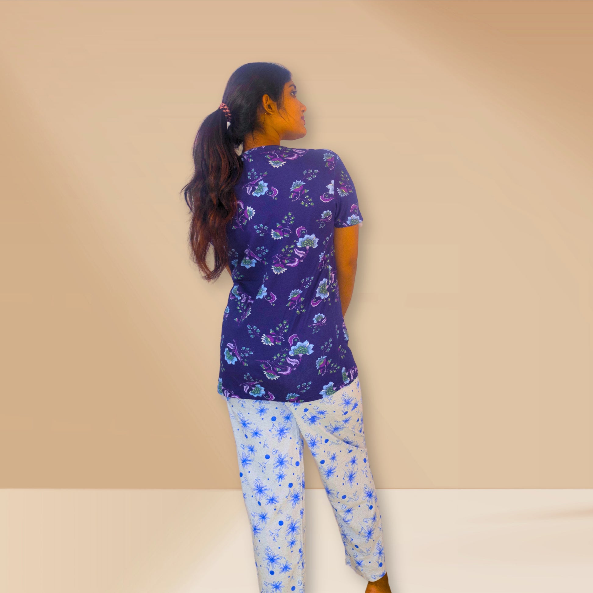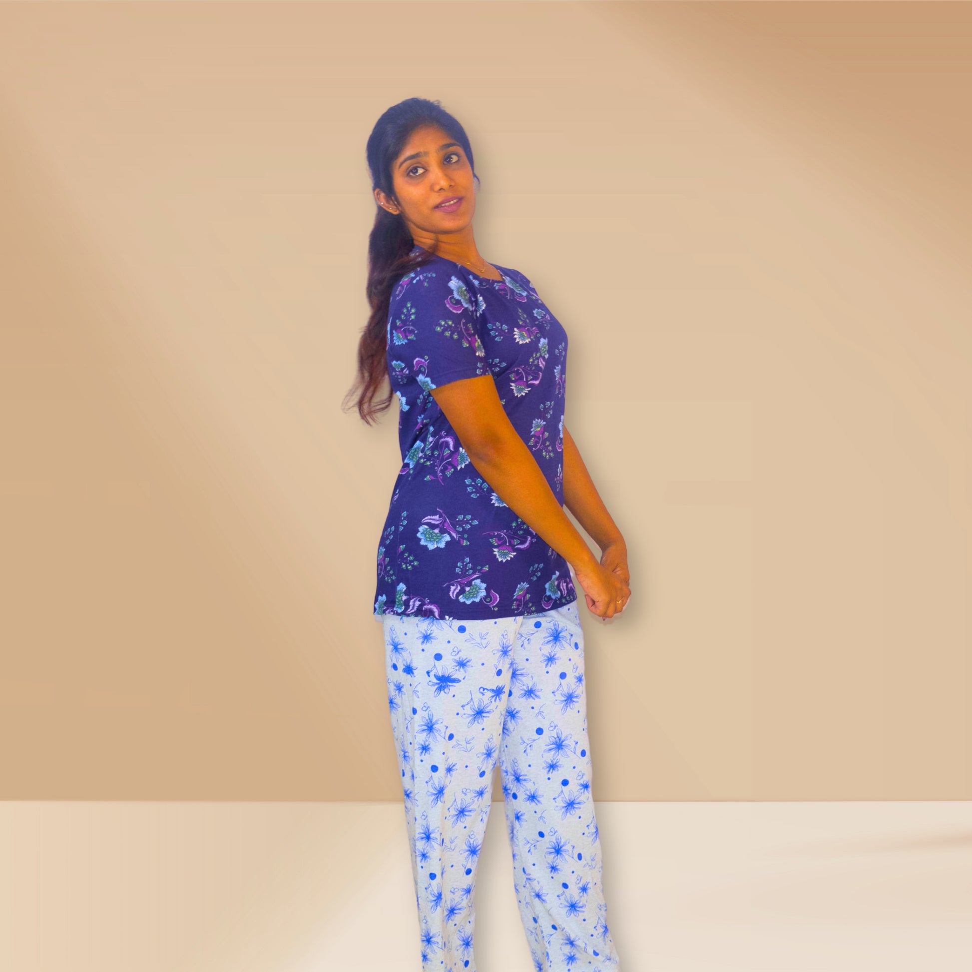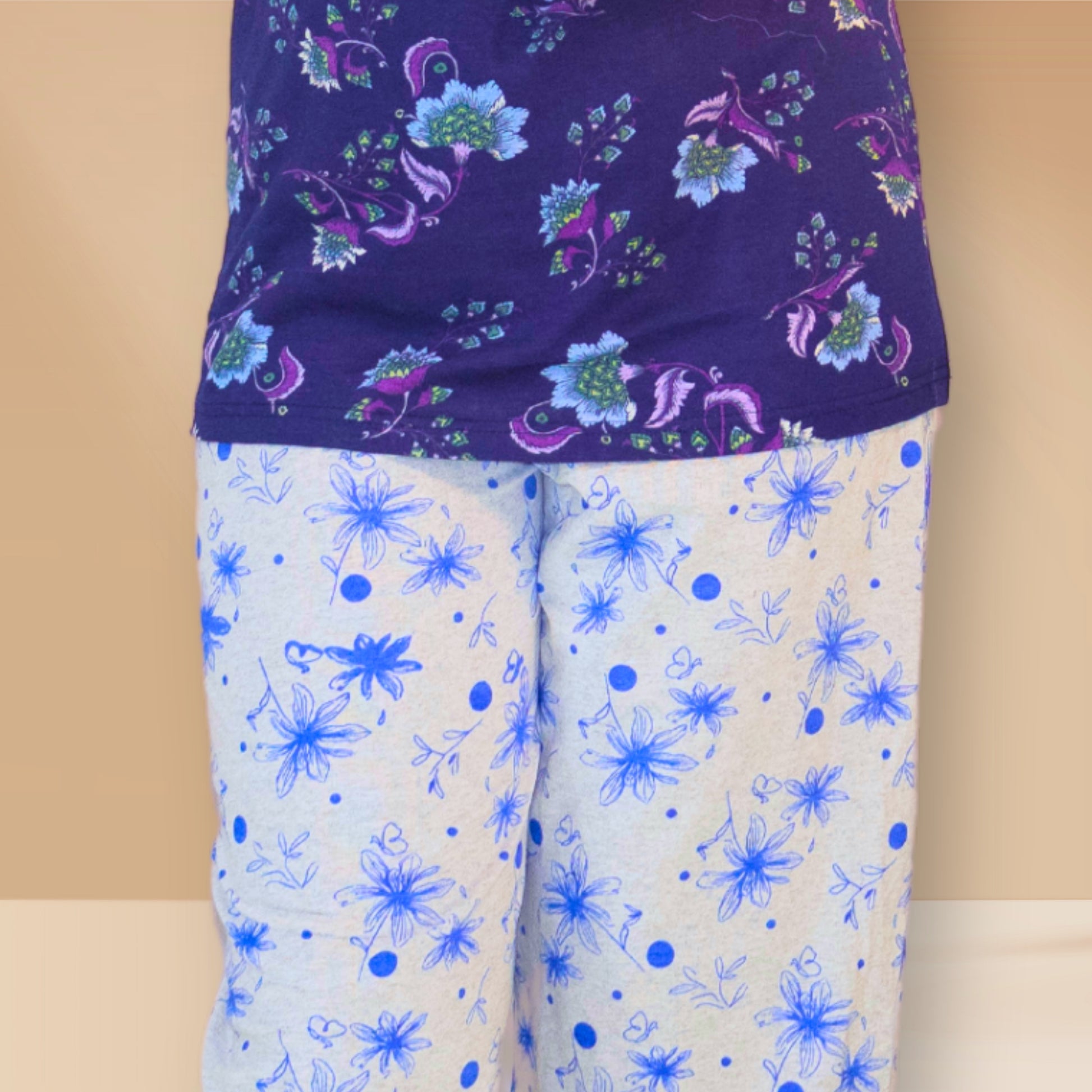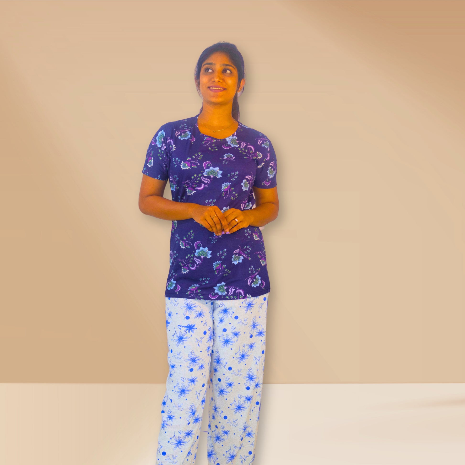 नीले और हल्के भूरे रंग की पुष्प और अमूर्त प्रिंट वाली M&M नाइट ड्रेस