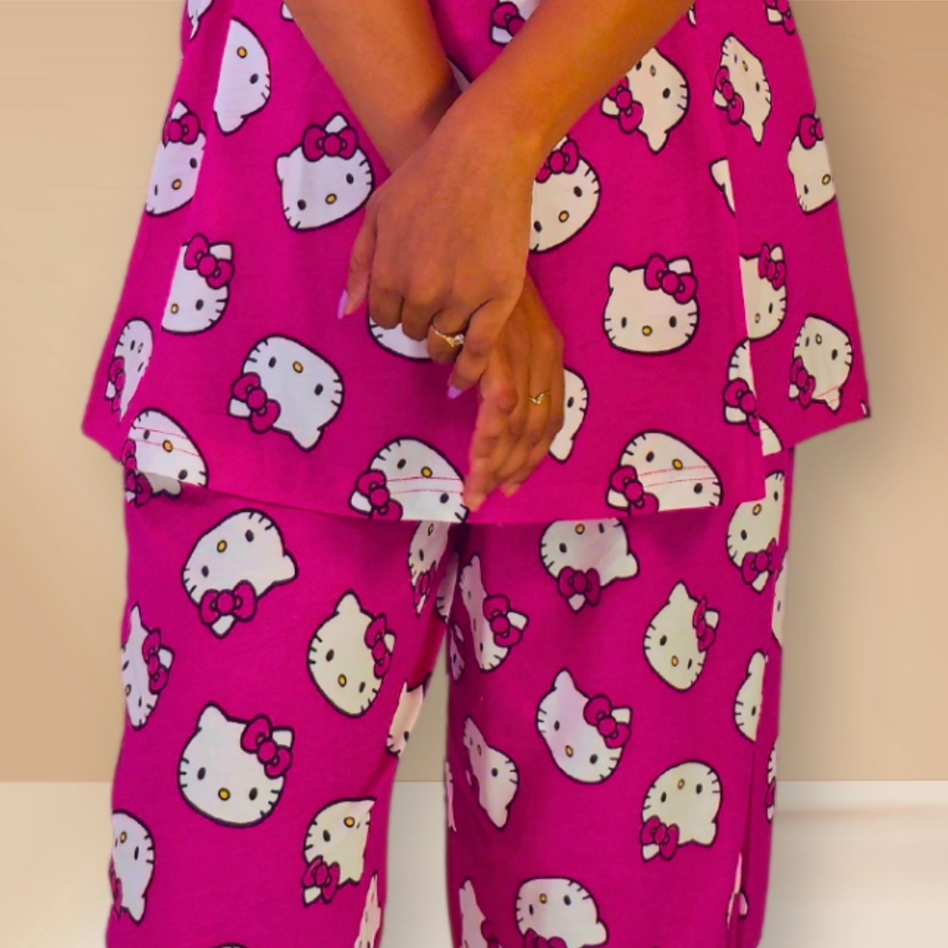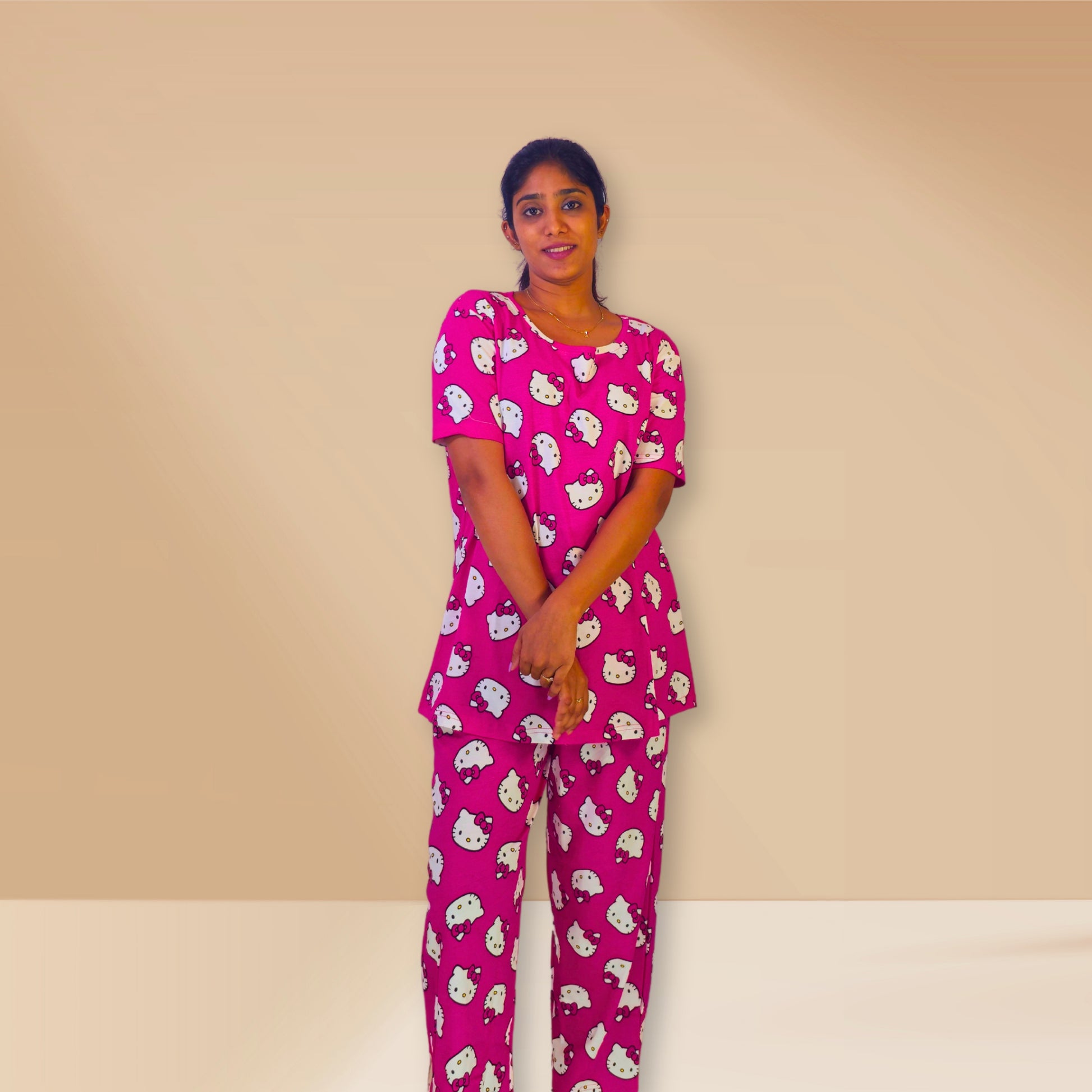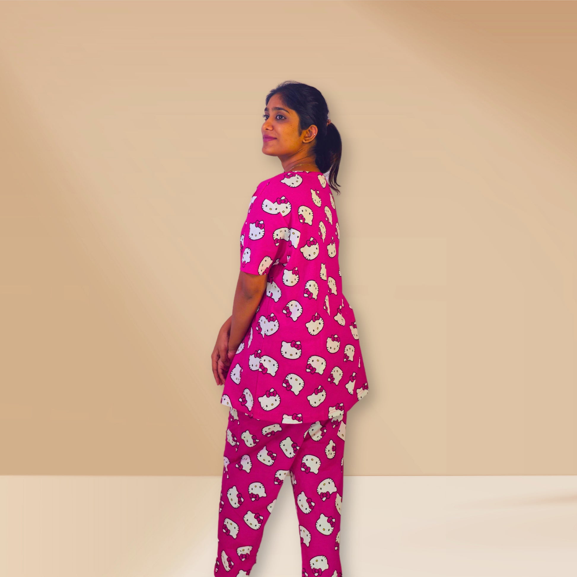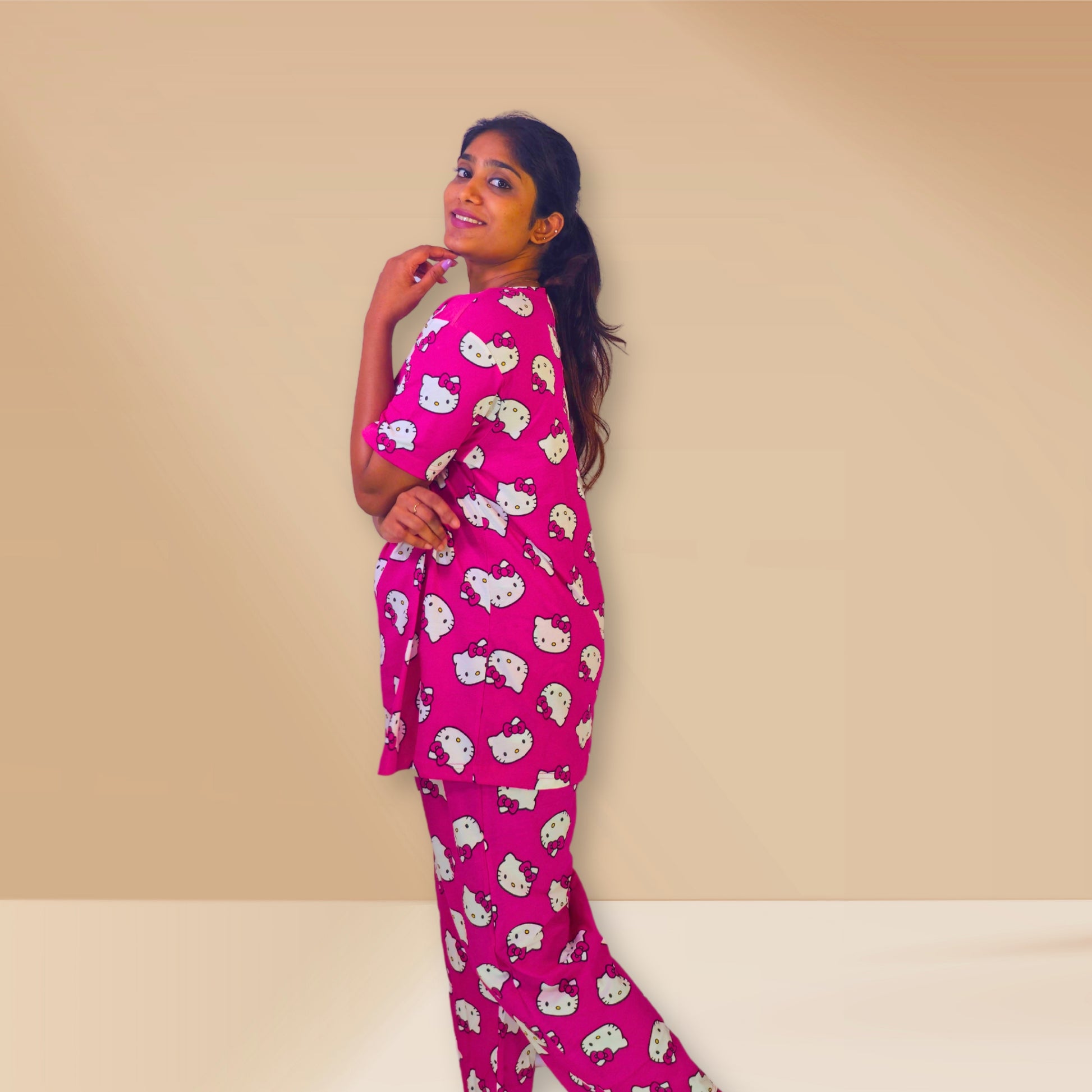 बिल्ली के बच्चे के प्रिंट के साथ बोल्ड गुलाबी को-ऑर्ड नाइट ड्रेस सेट।