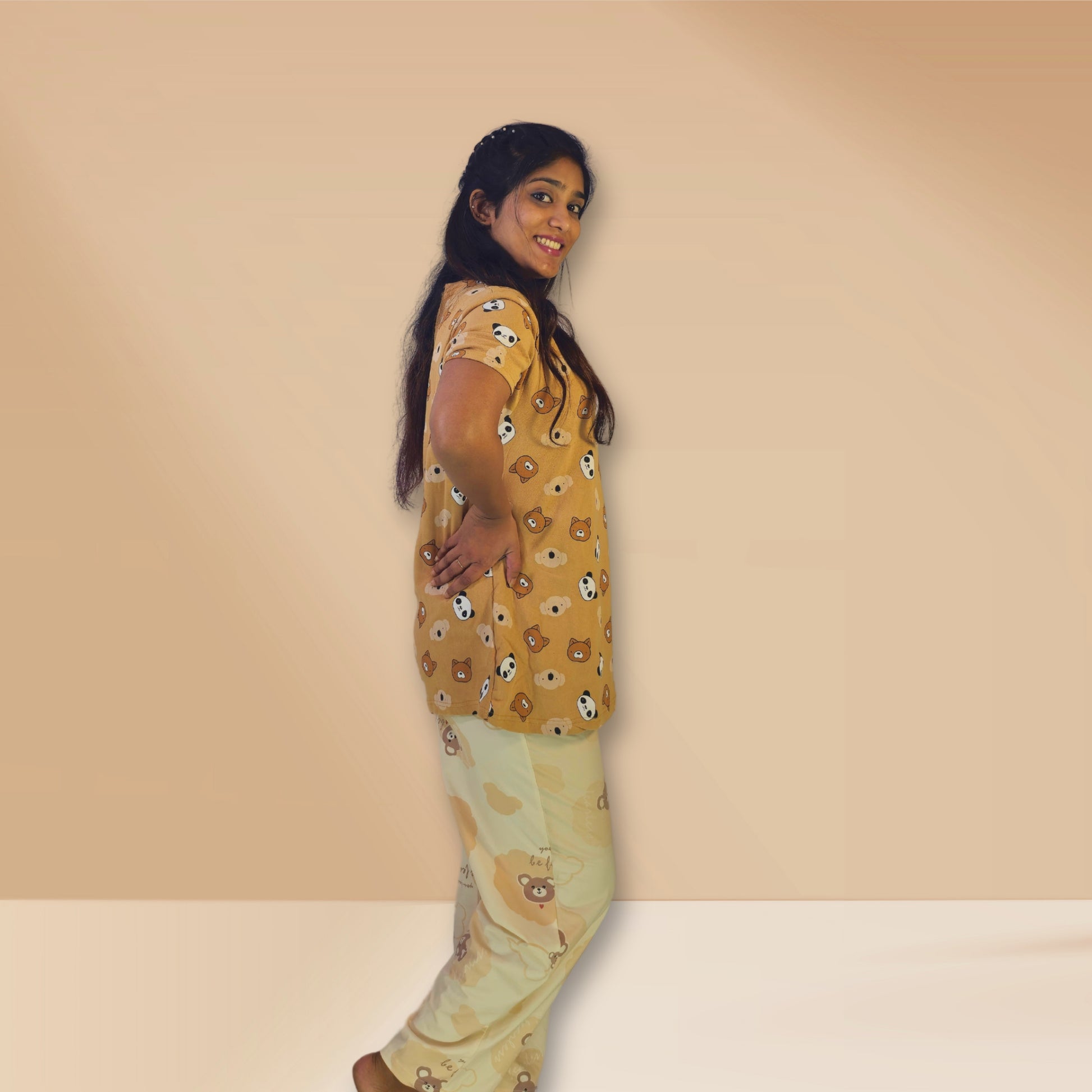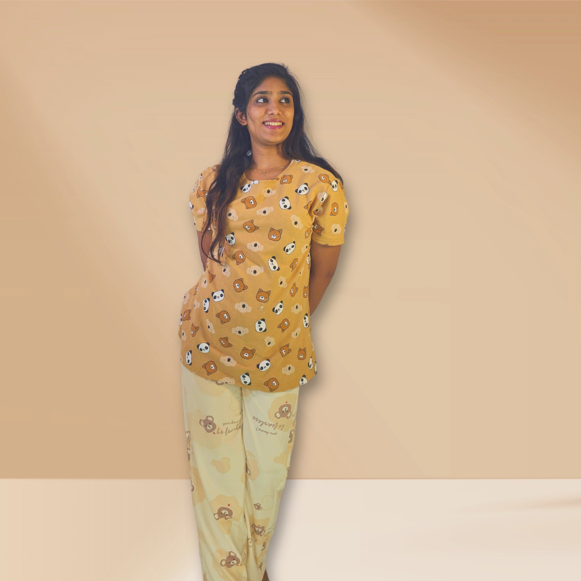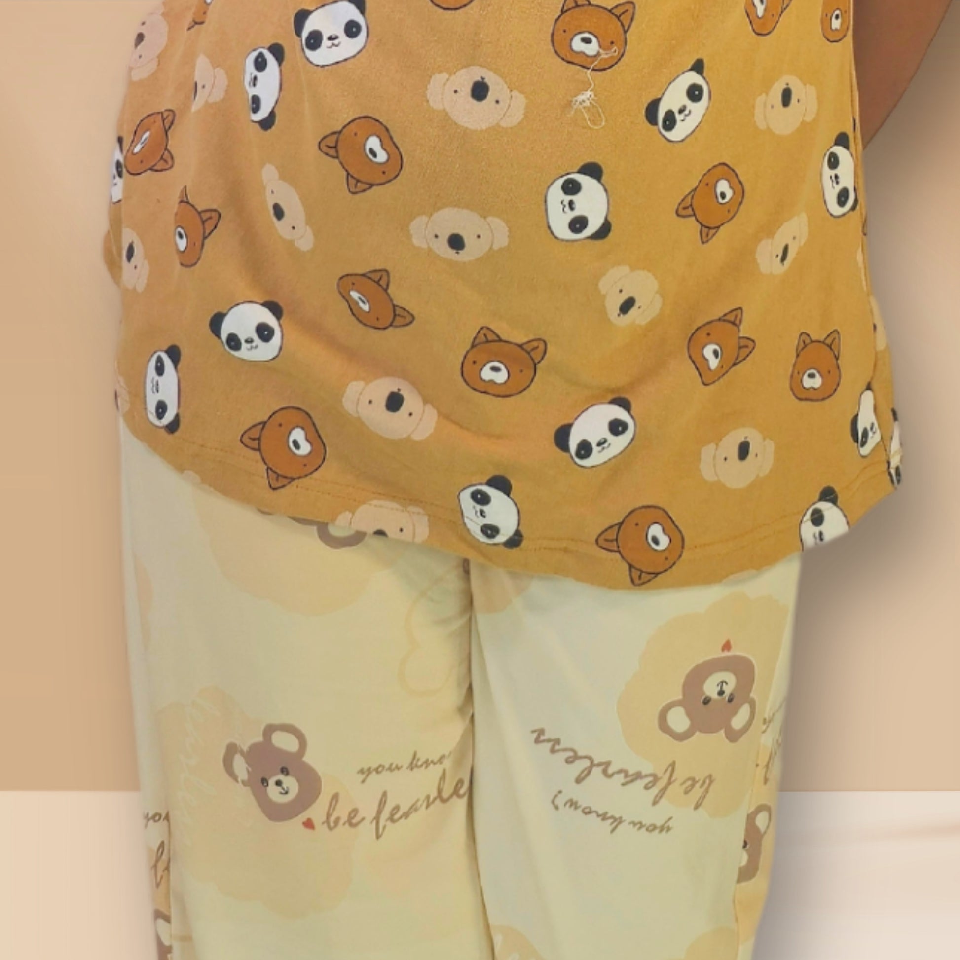 निचला भाग: टखने तक लम्बा, भालू प्रिंट के साथ प्रक्षालित गेहूँ रंग।