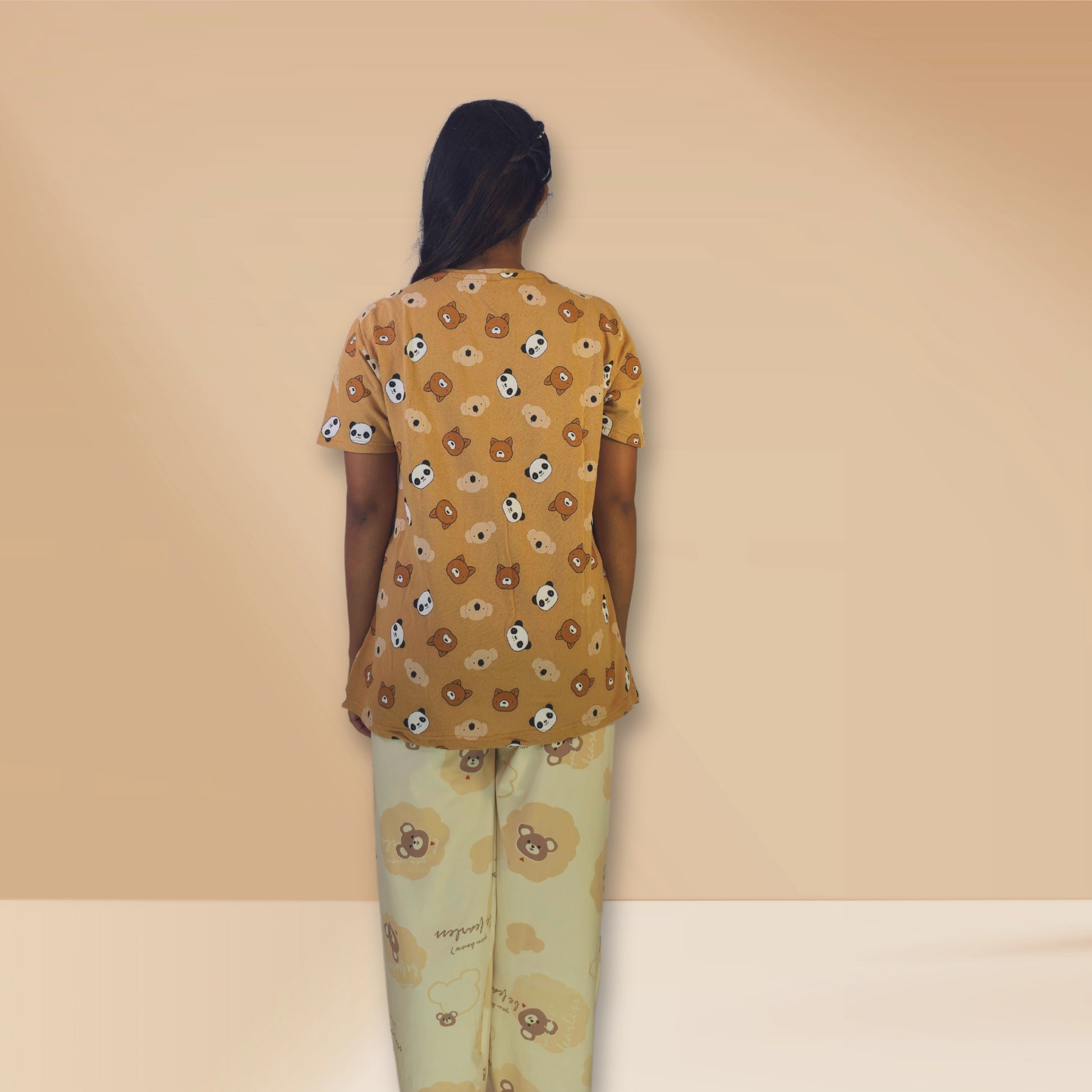 टॉप: भालू, कोला और पांडा प्रिंट के साथ भूरा