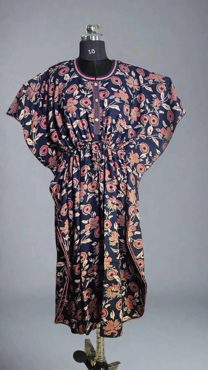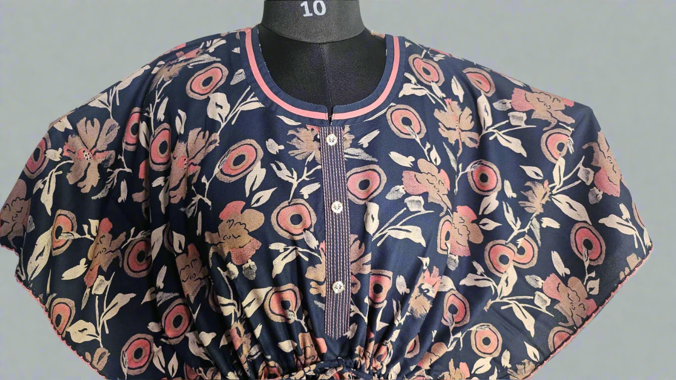 ऑफ-व्हाइट आर्किड किस के साथ मैजेंटा पुष्प प्रिंट फ्रिल्ड नाइटी।