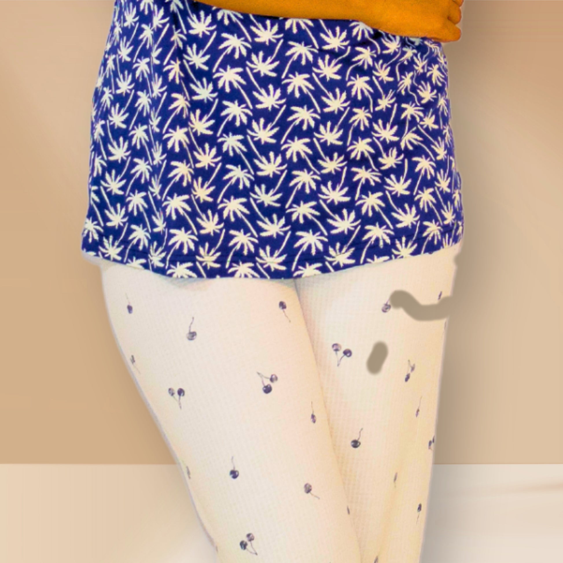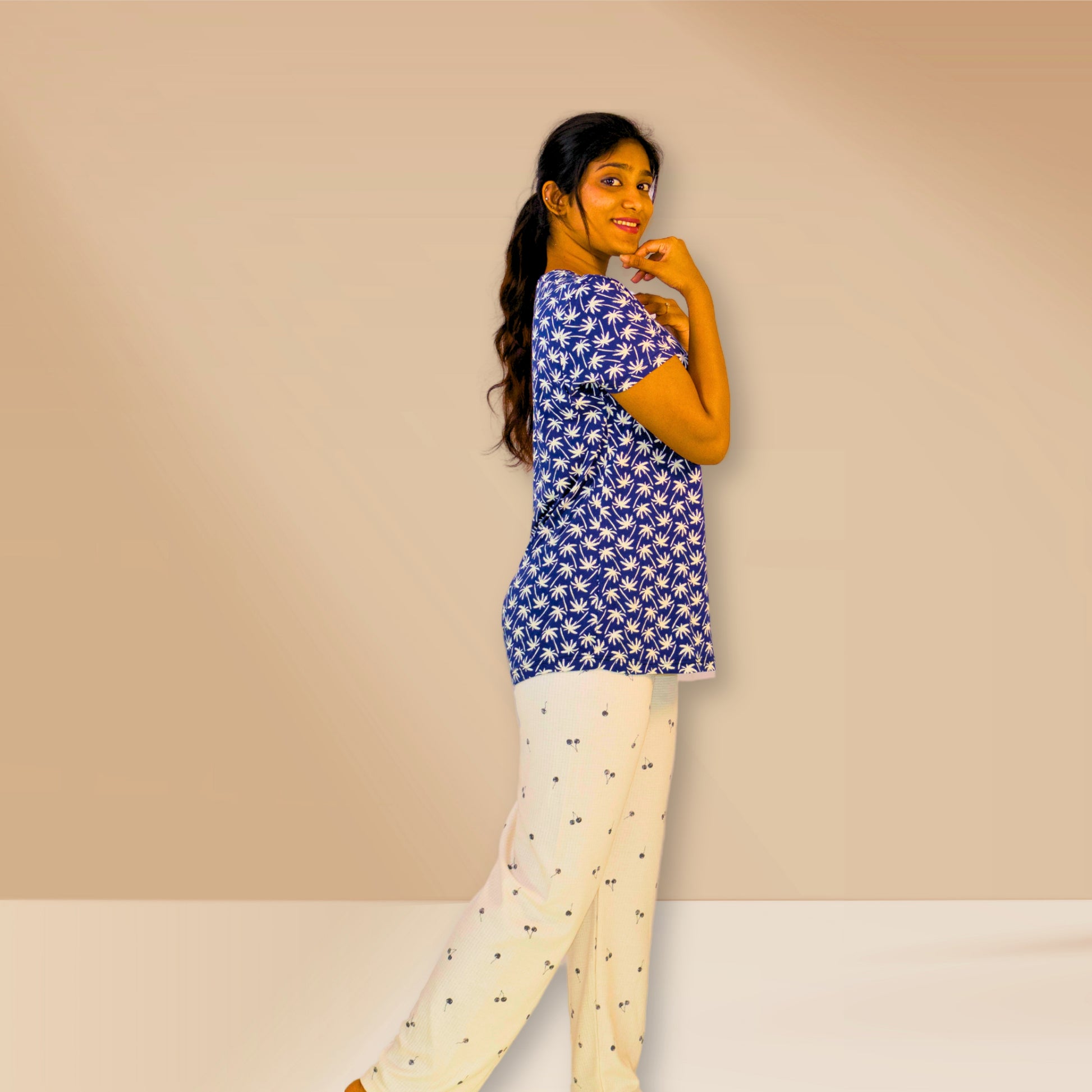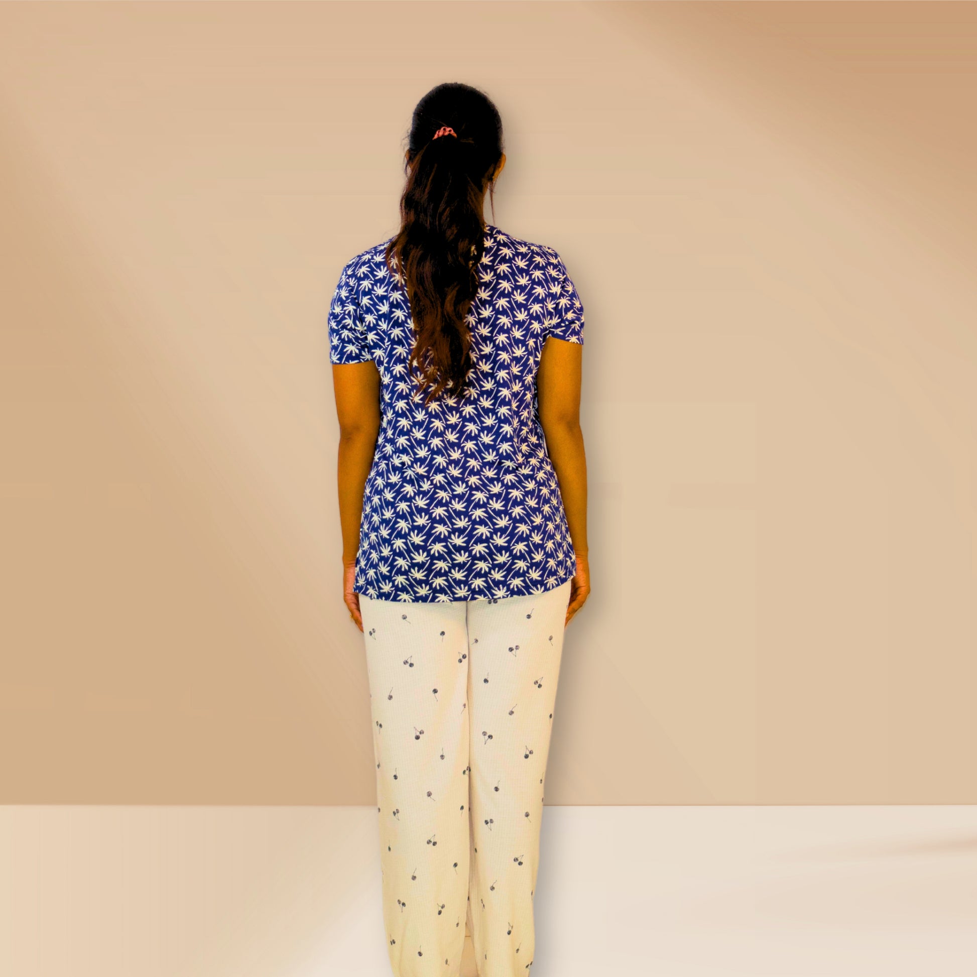 टॉप: नारियल ग्राफिक प्रिंट के साथ गहरा नीला।