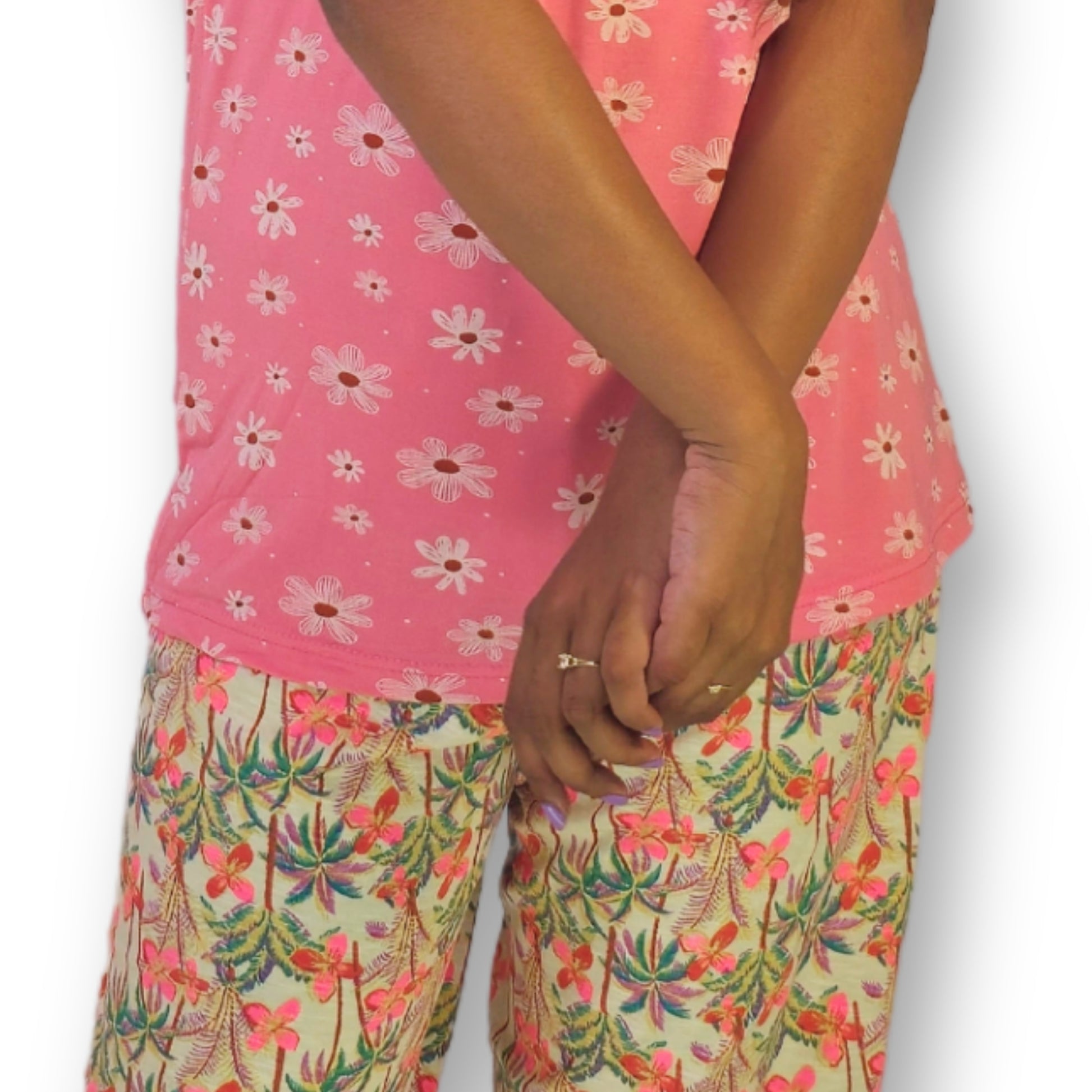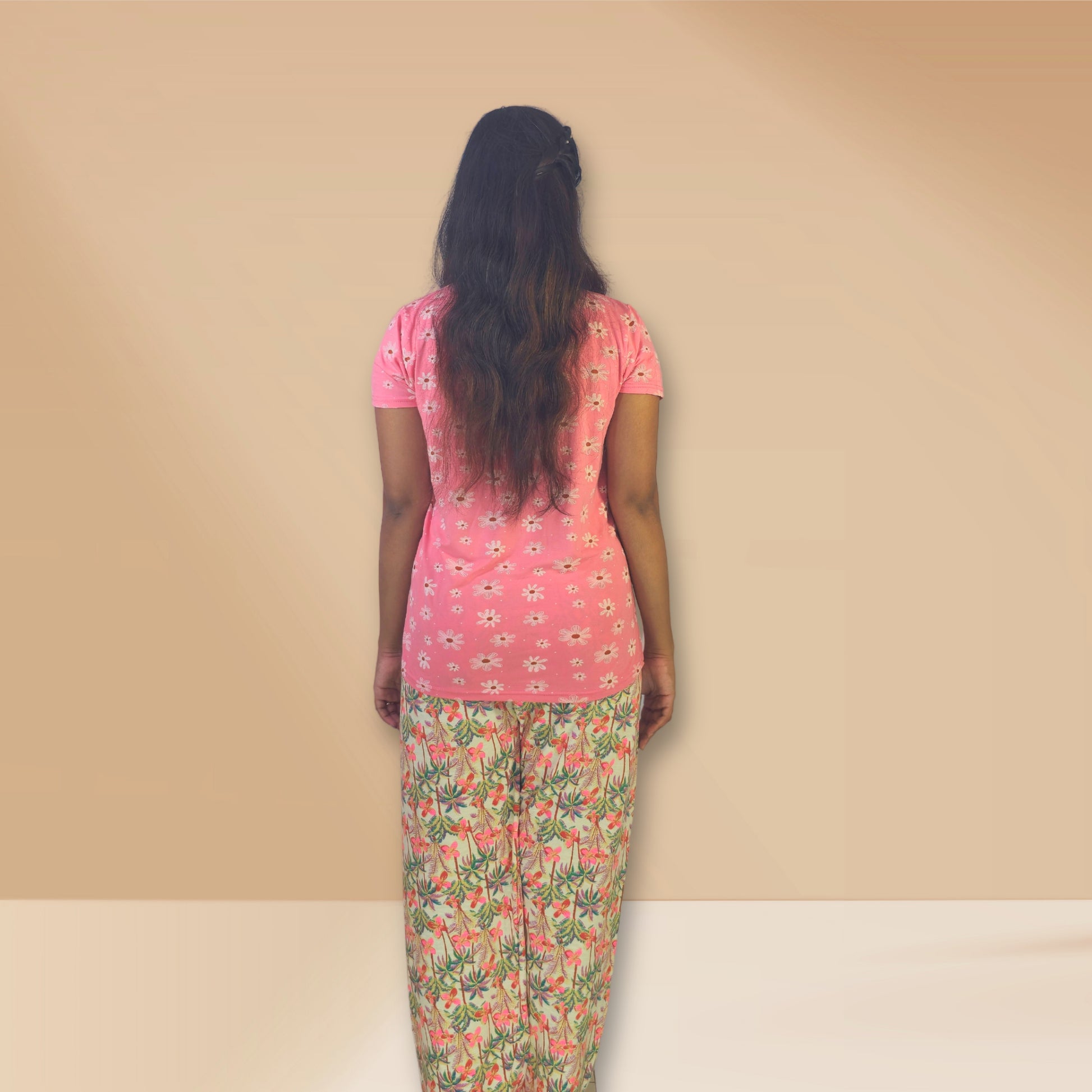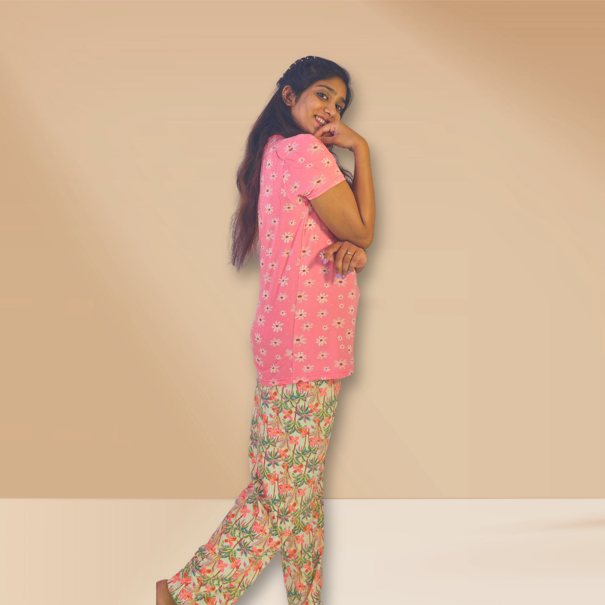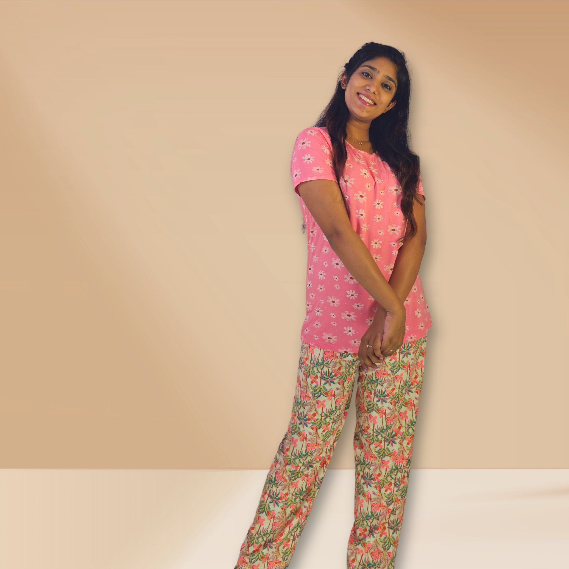 टॉप: गहरे गुलाबी रंग के साथ हल्के पुष्प प्रिंट।