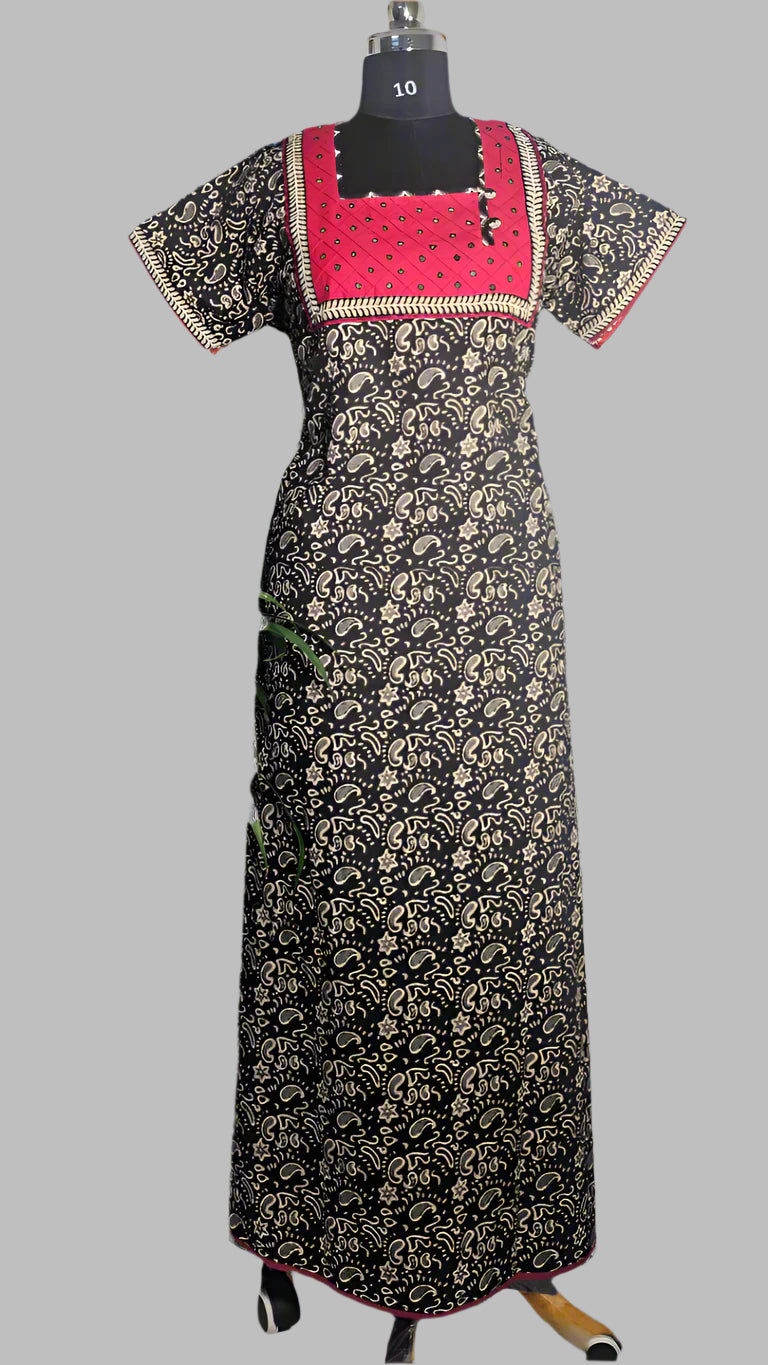 ऑफ-व्हाइट आर्किड किस के साथ मैजेंटा पुष्प प्रिंट फ्रिल्ड नाइटी।