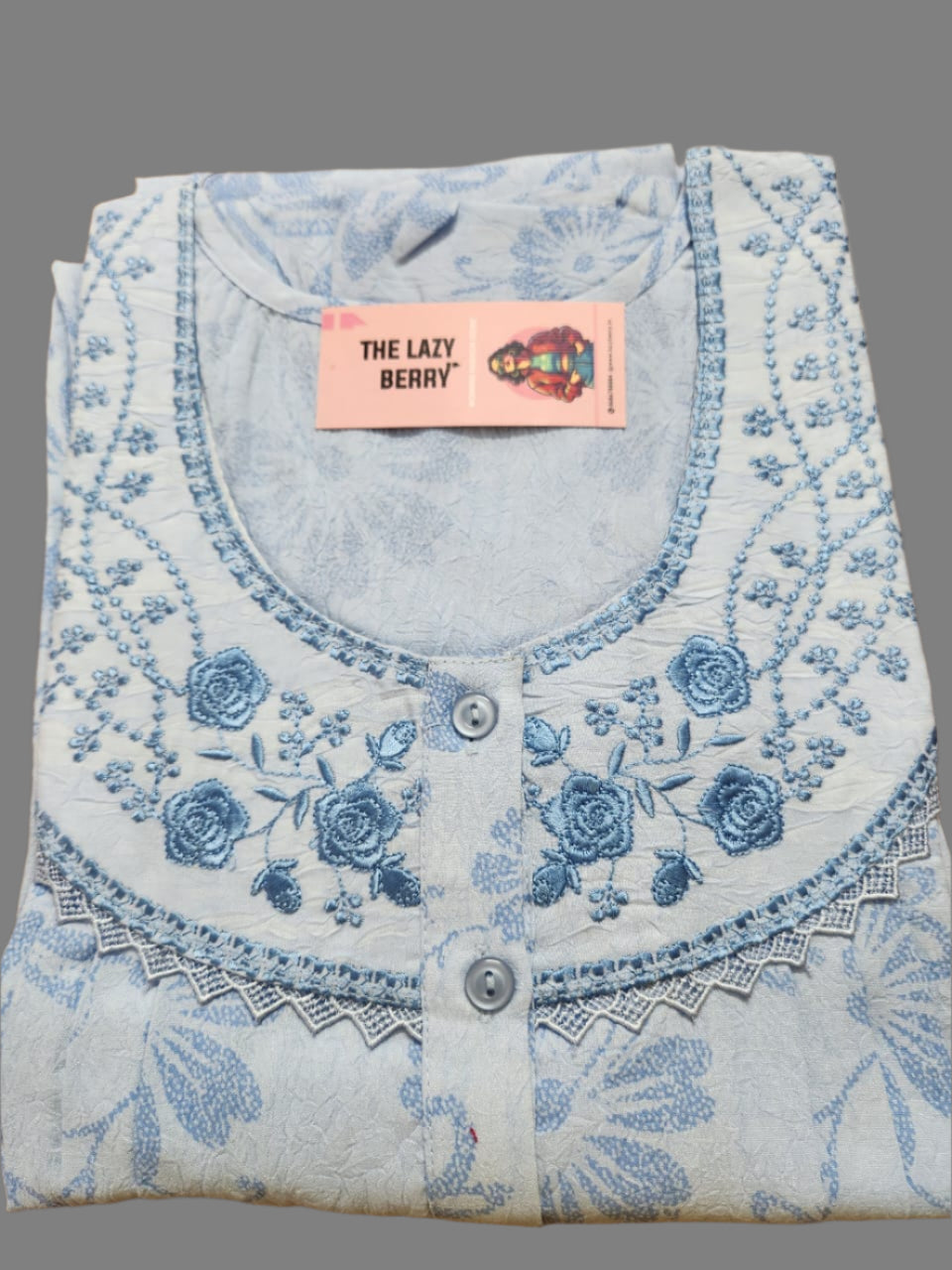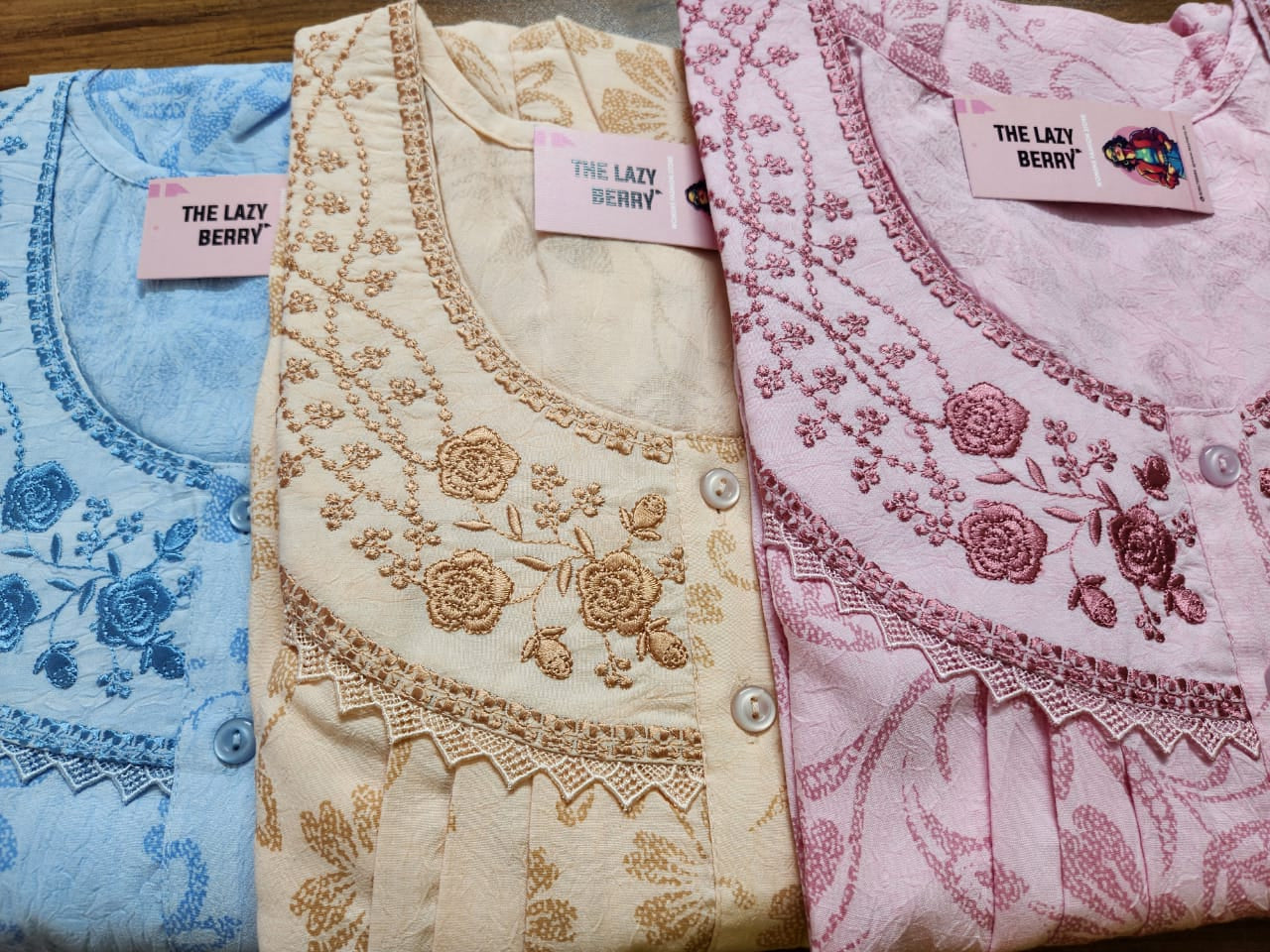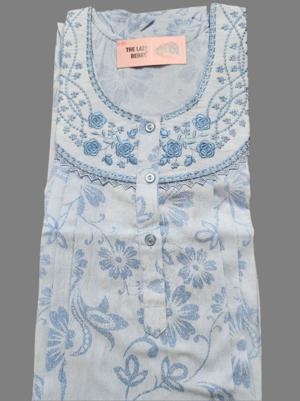 ऑफ-व्हाइट आर्किड किस के साथ मैजेंटा पुष्प प्रिंट फ्रिल्ड नाइटी।