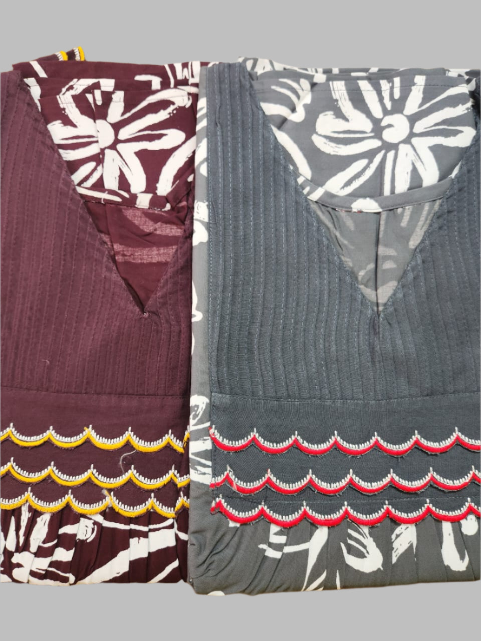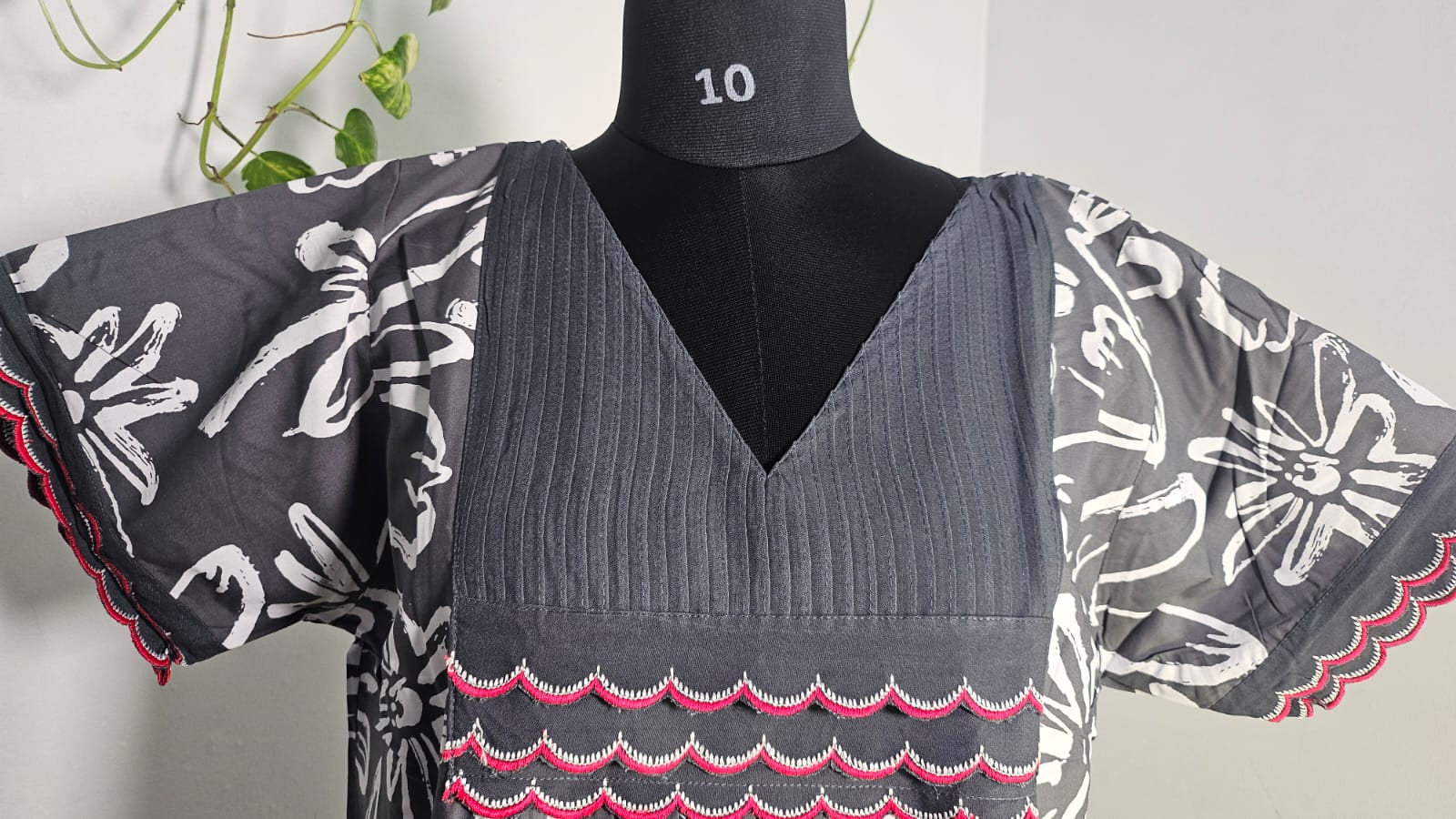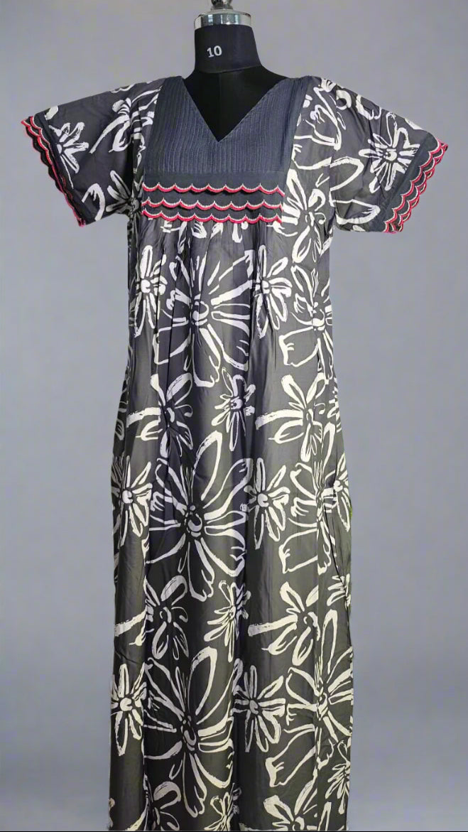 ऑफ-व्हाइट आर्किड किस के साथ मैजेंटा पुष्प प्रिंट फ्रिल्ड नाइटी।