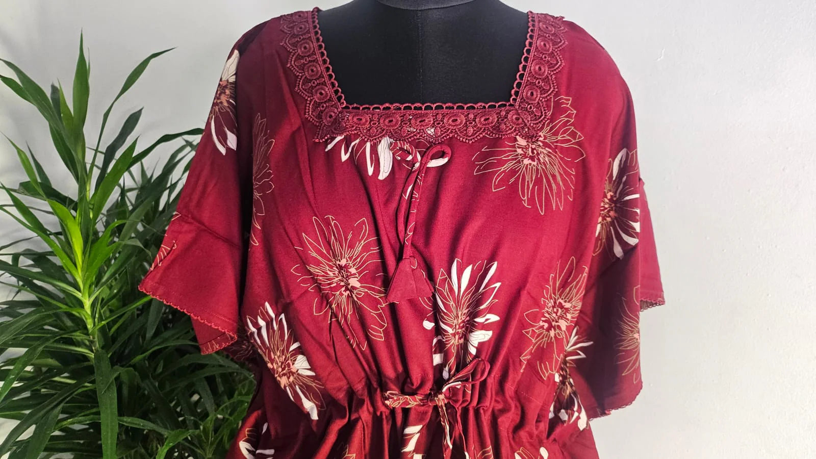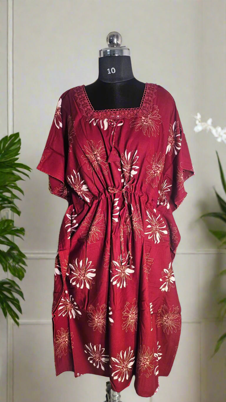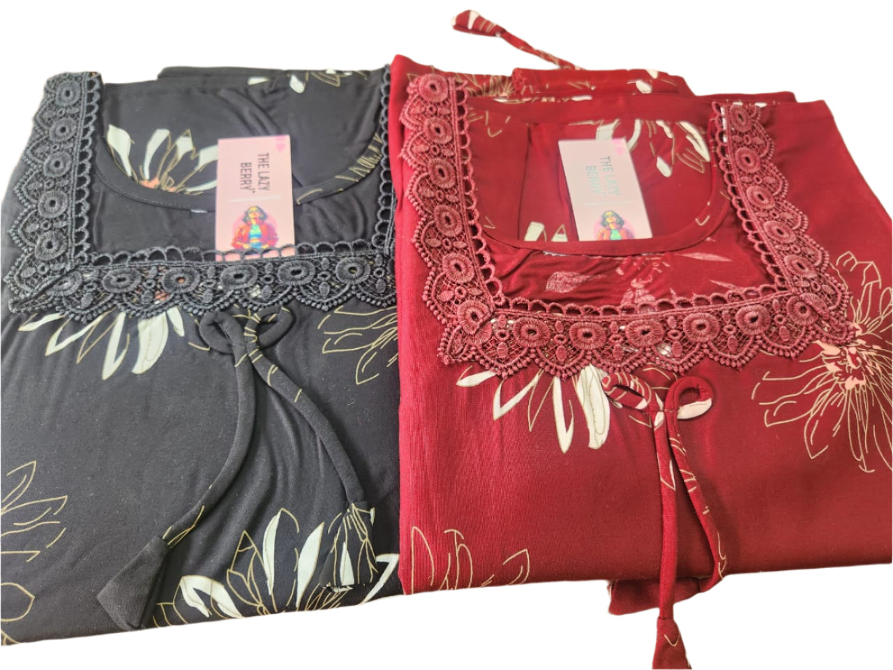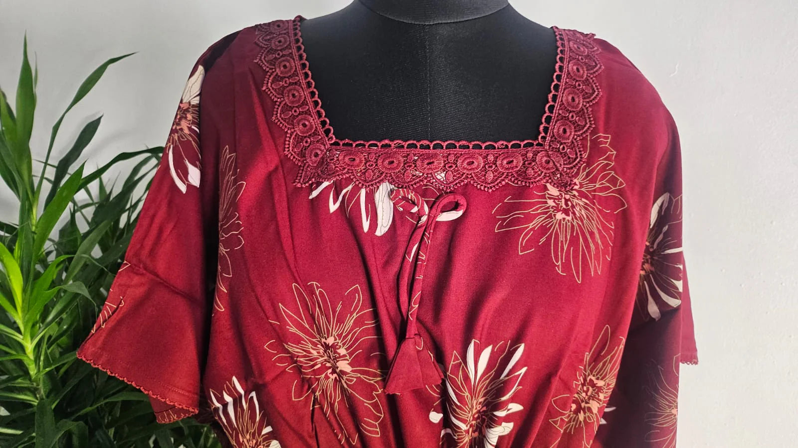 ऑफ-व्हाइट आर्किड किस के साथ मैजेंटा पुष्प प्रिंट फ्रिल्ड नाइटी।
