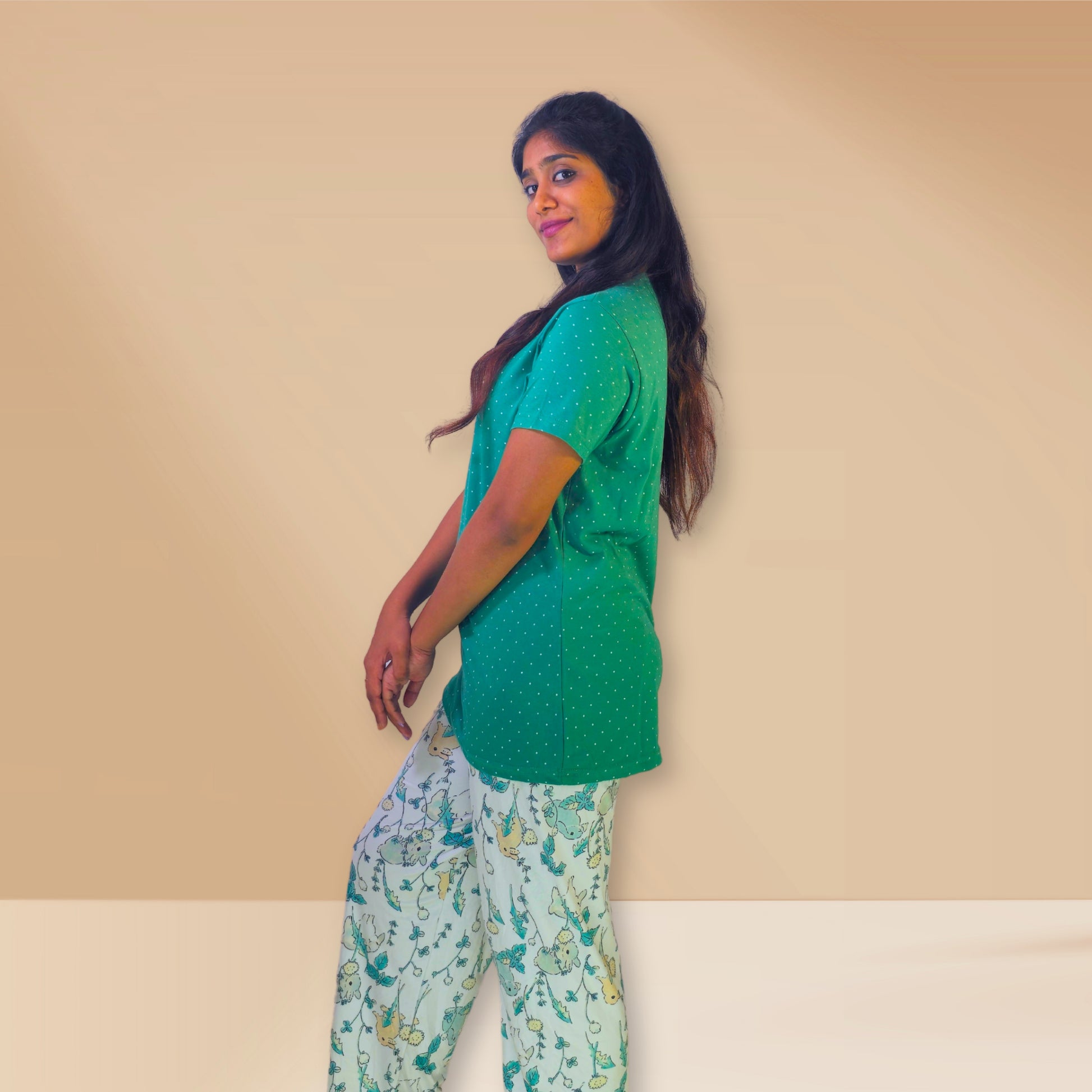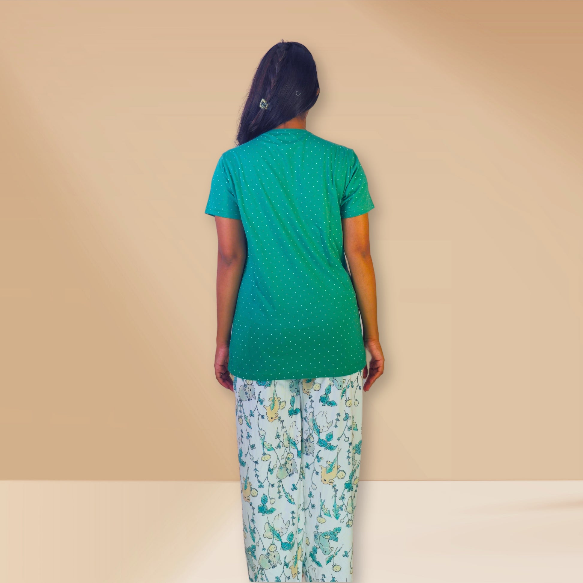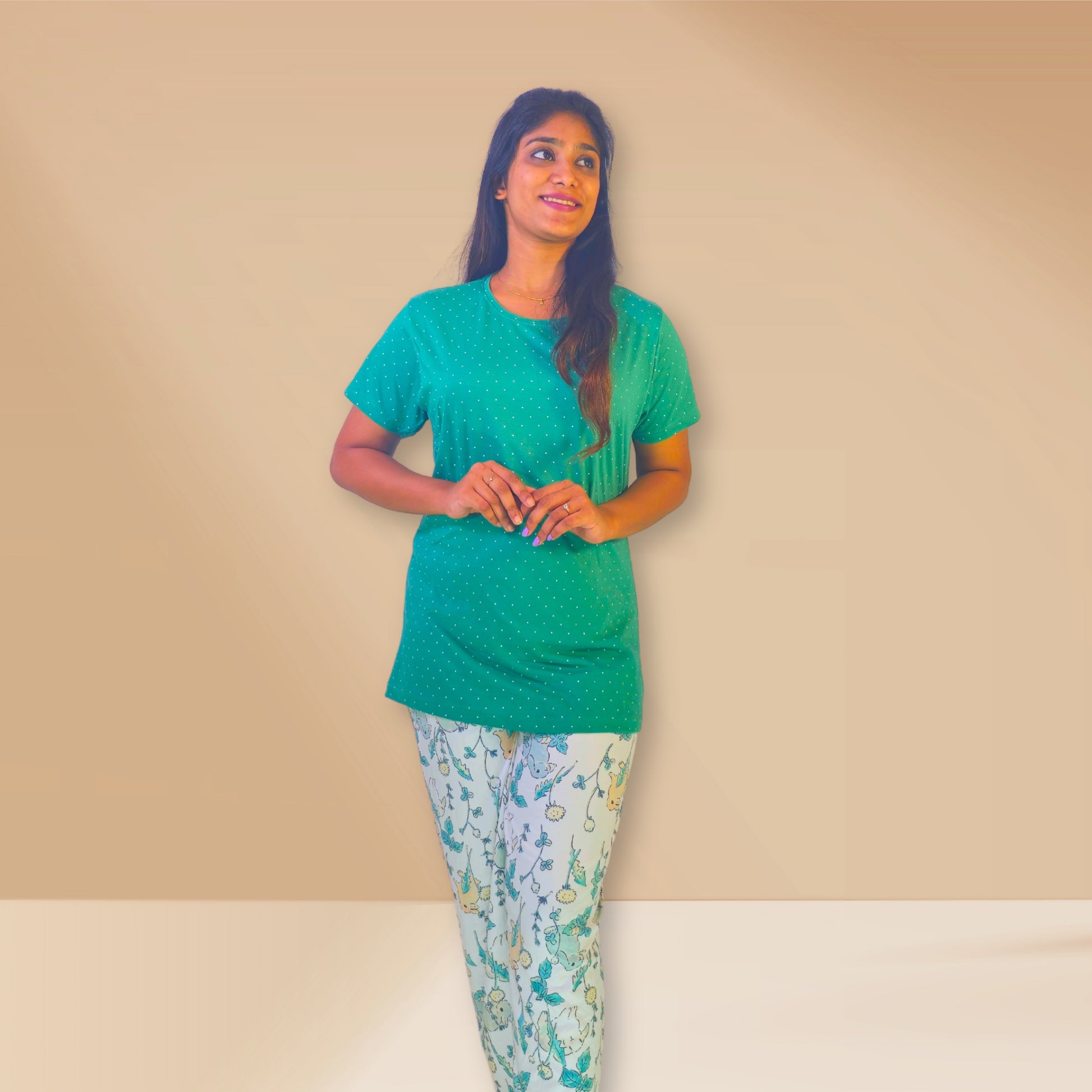 पोल्का डॉट्स और पुष्प प्रिंट के साथ हरा और सफेद।