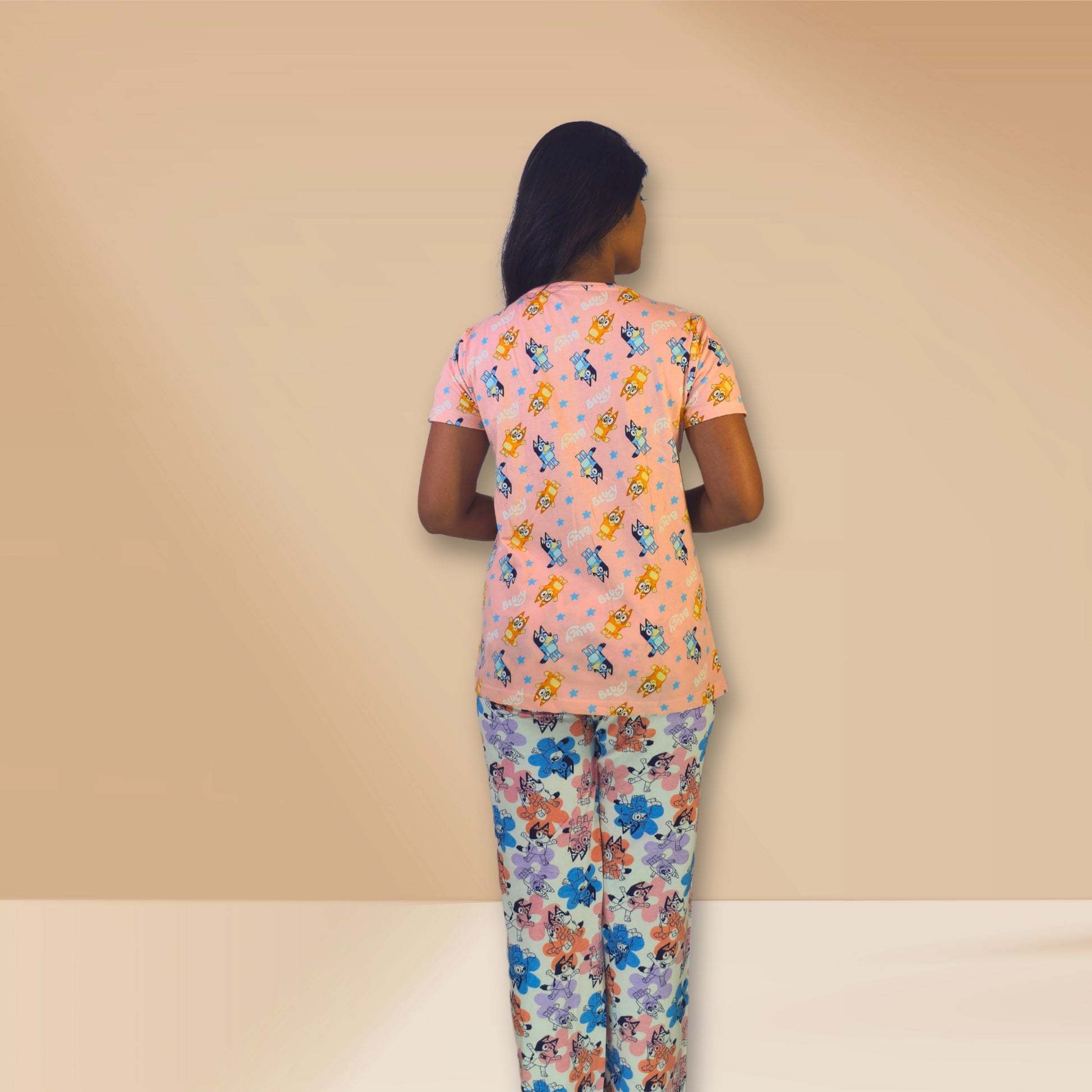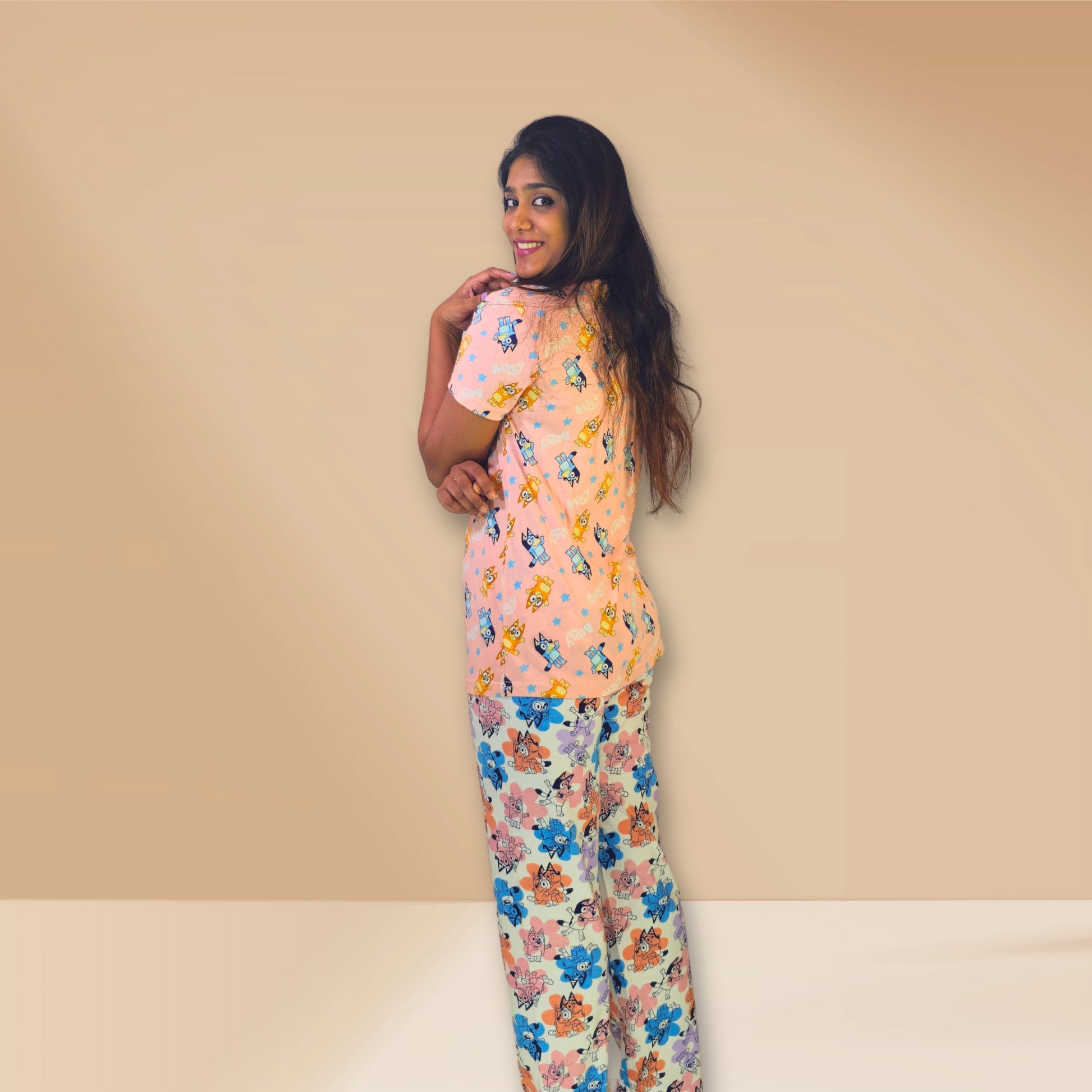 हश पपी पीच और सफेद ब्लू प्रिंट्स के साथ एम एंड एम नाइट ड्रेस