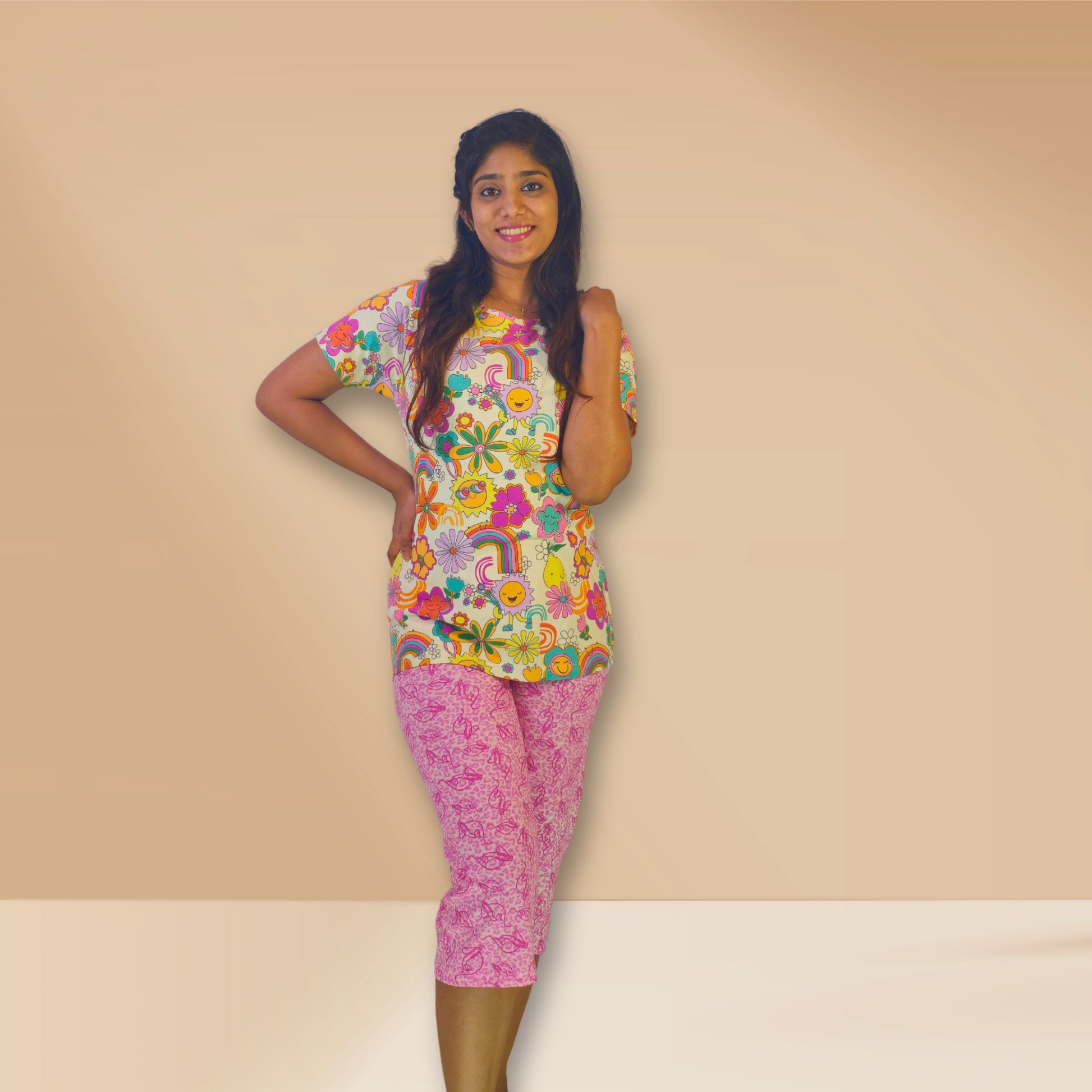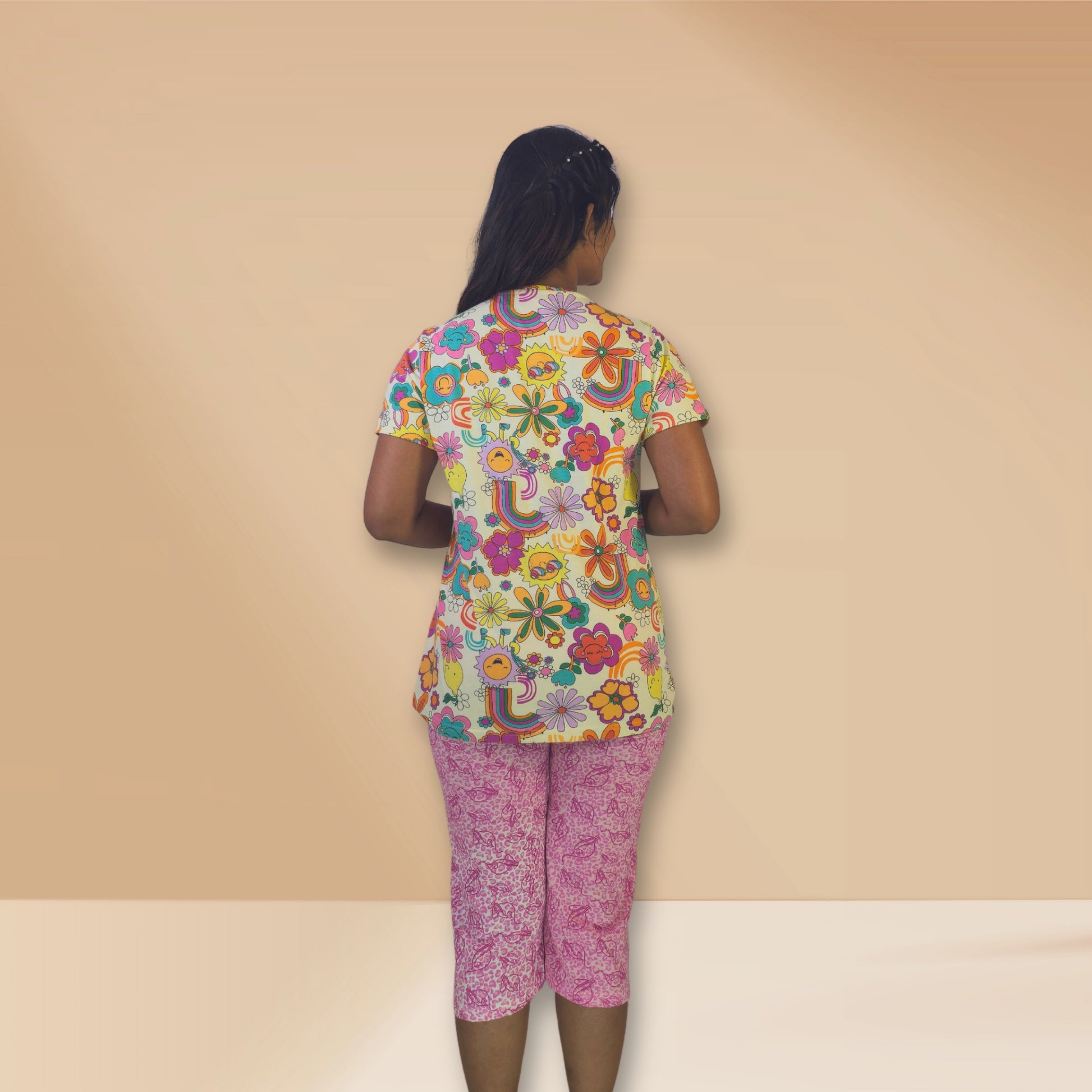 हल्के पीले और गुलाबी रंग की अमूर्त प्रिंट वाली M&M नाइट ड्रेस
