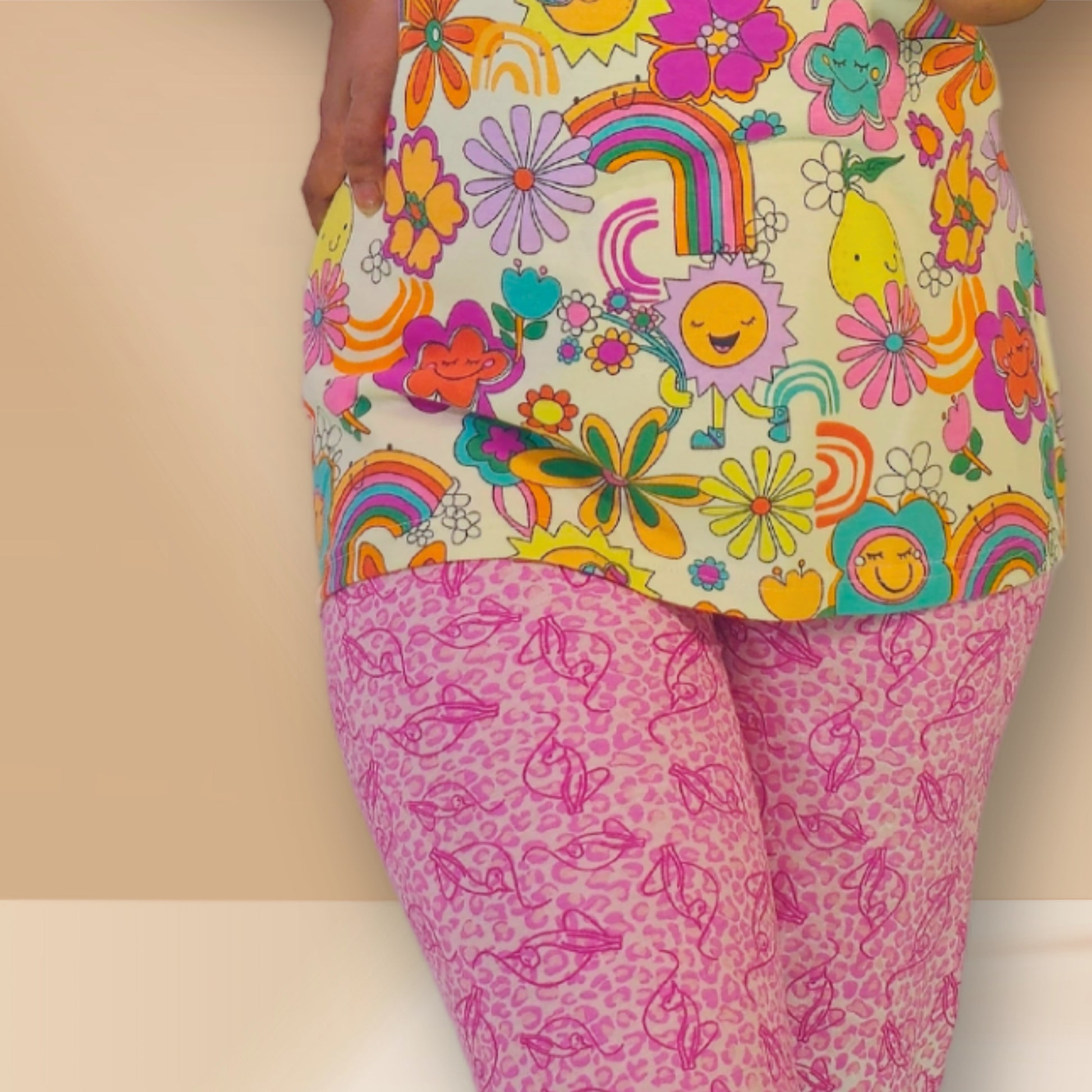 निचला भाग: घुटने से नीचे तक की लंबाई, गहरे गुलाबी रंग के अमूर्त प्रिंट के साथ हल्के गुलाबी रंग की।