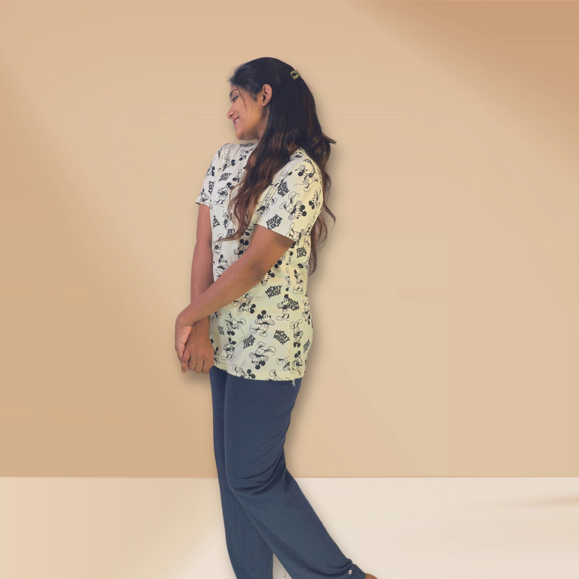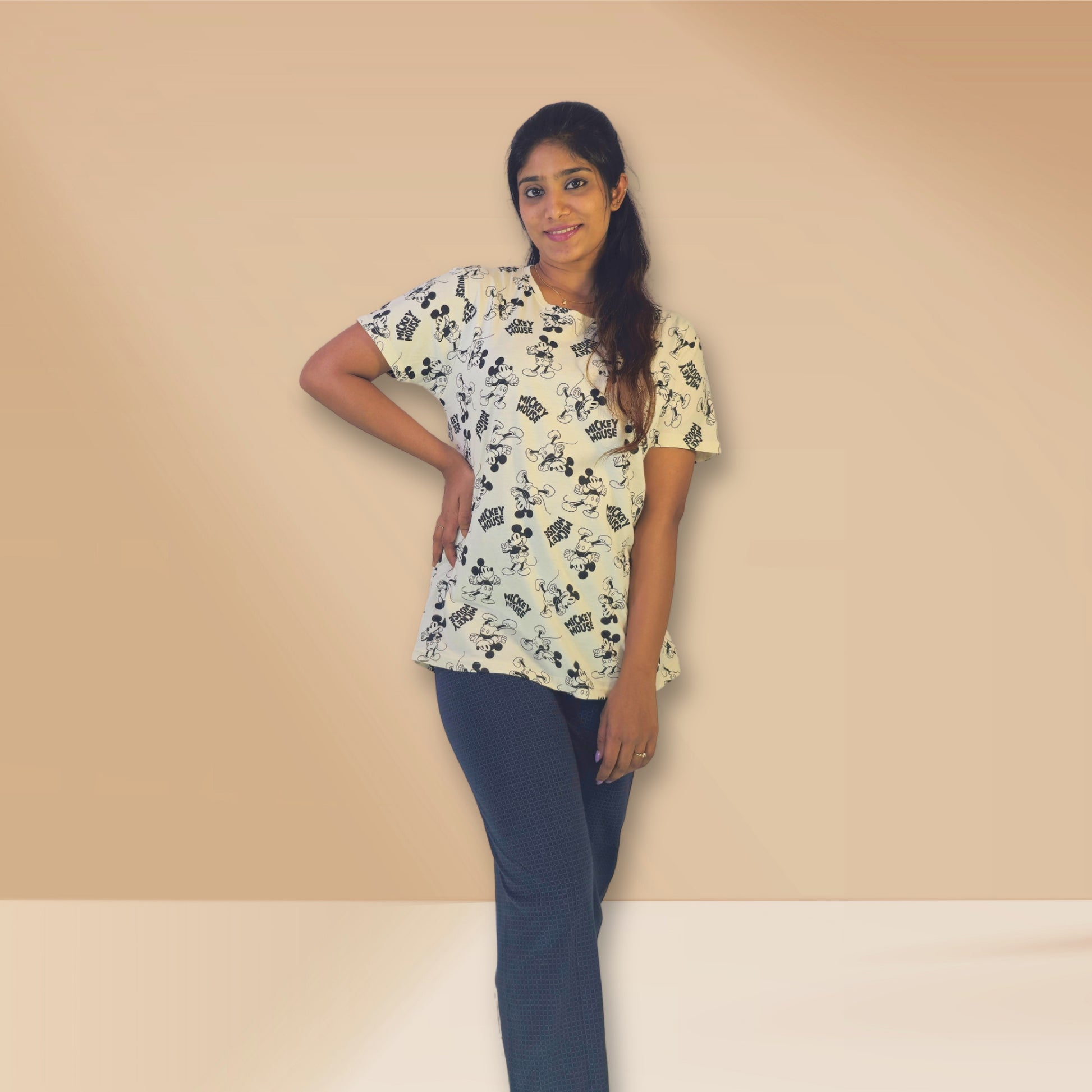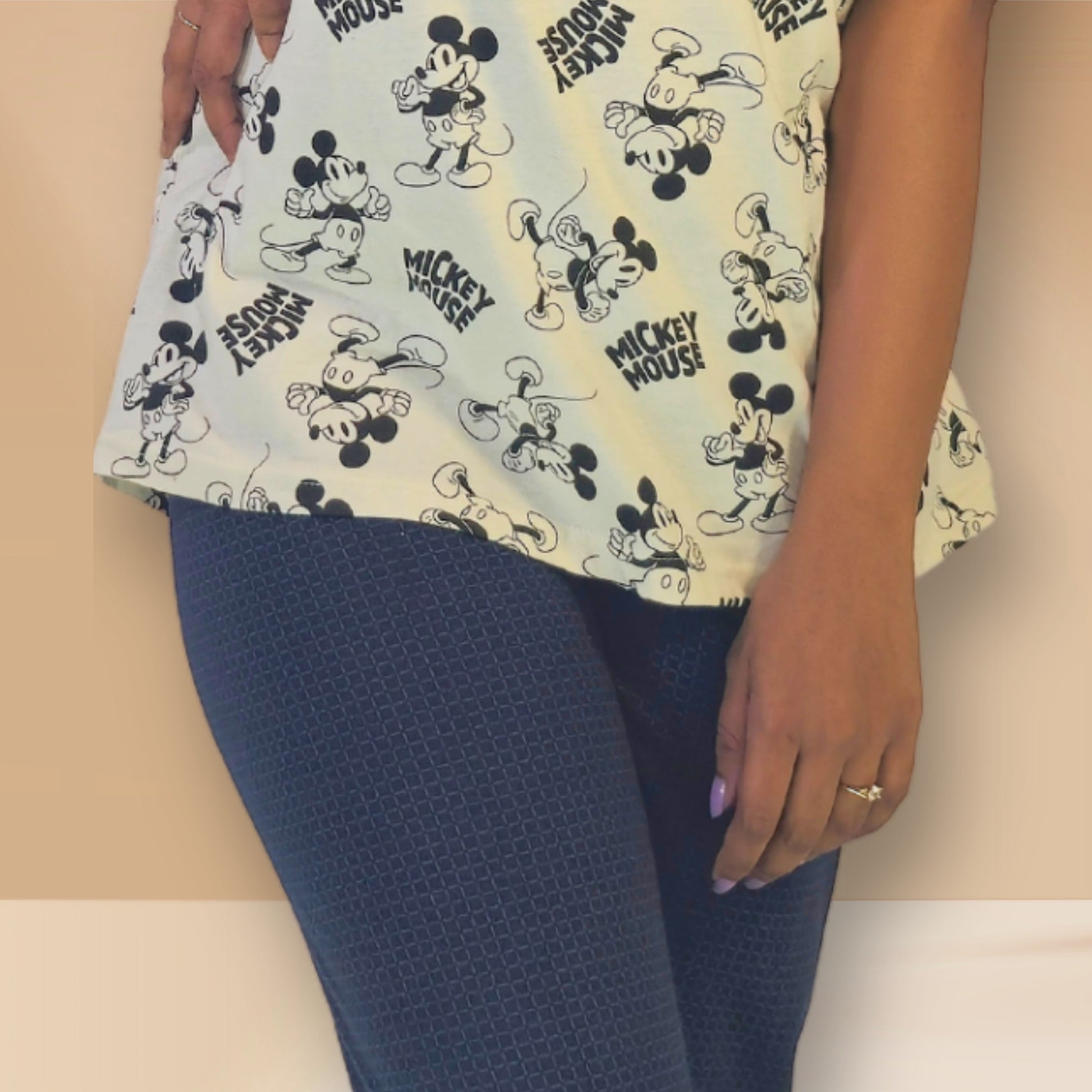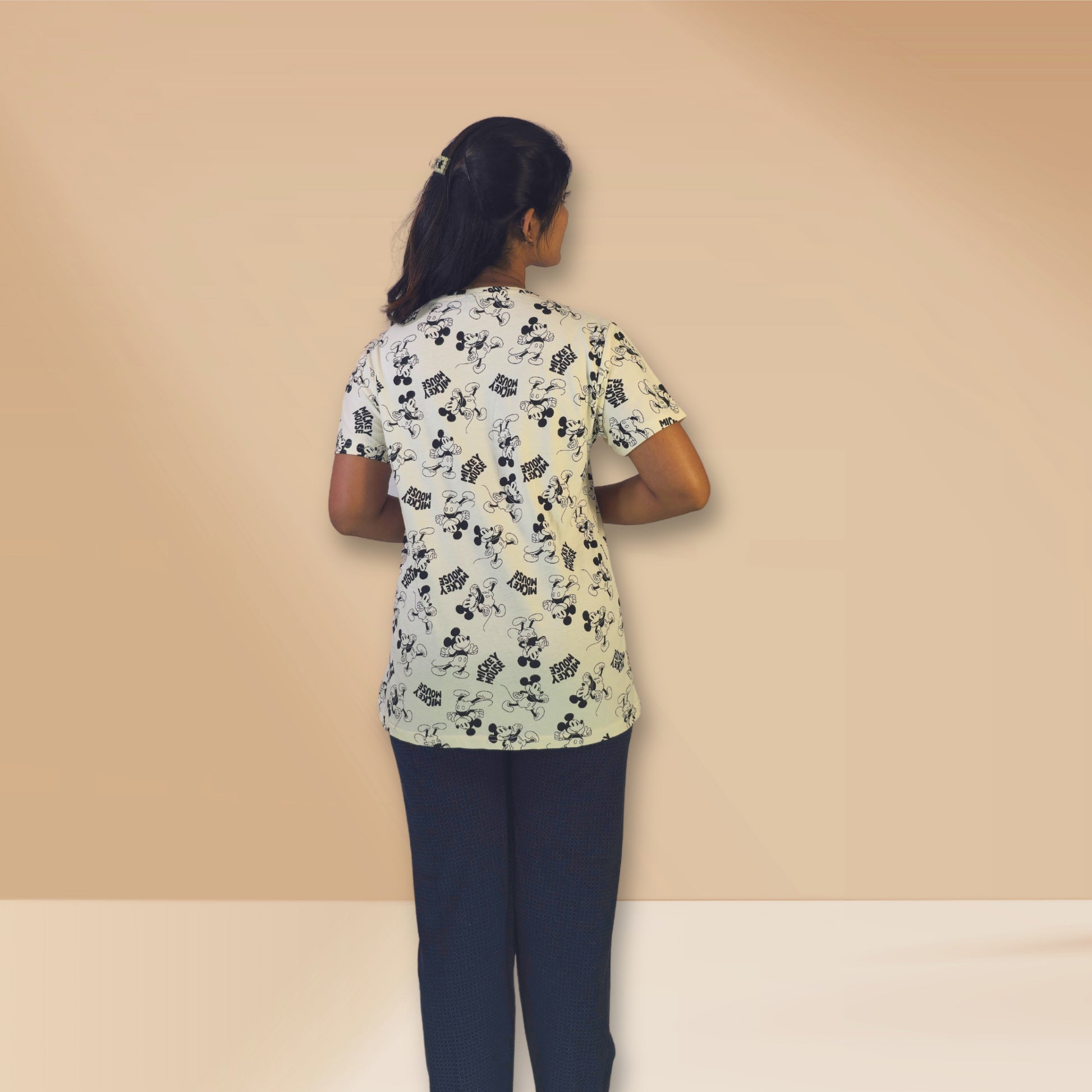 शीर्ष: मिकी माउस प्रिंट के साथ ऑफ-व्हाइट।