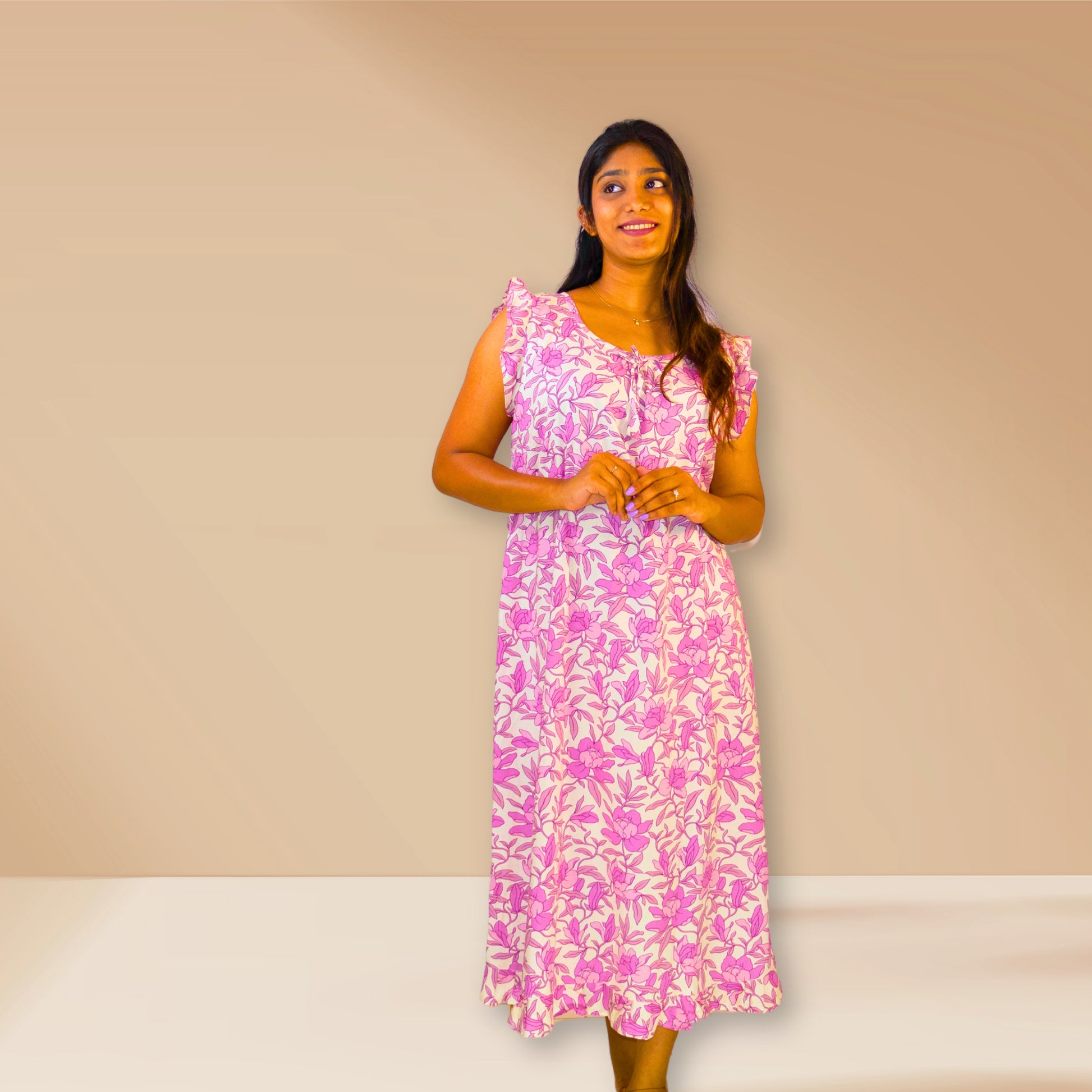 ऑफ-व्हाइट आर्किड किस के साथ मैजेंटा पुष्प प्रिंट फ्रिल्ड नाइटी।