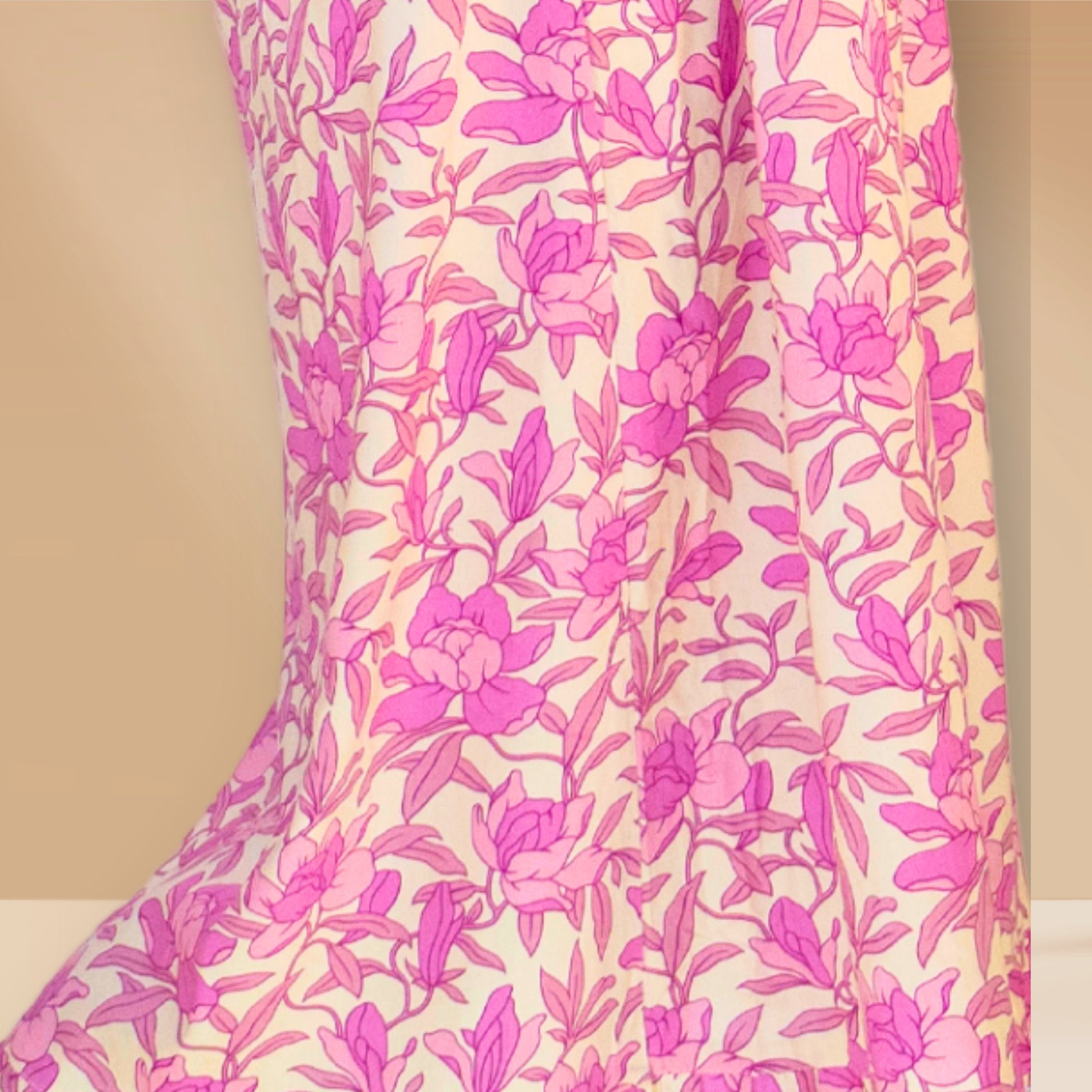डिजाइन: ऑर्किड किस मैजेंटा पुष्प प्रिंट के साथ ऑफ-व्हाइट, फ्रिल्स के साथ बिना आस्तीन।