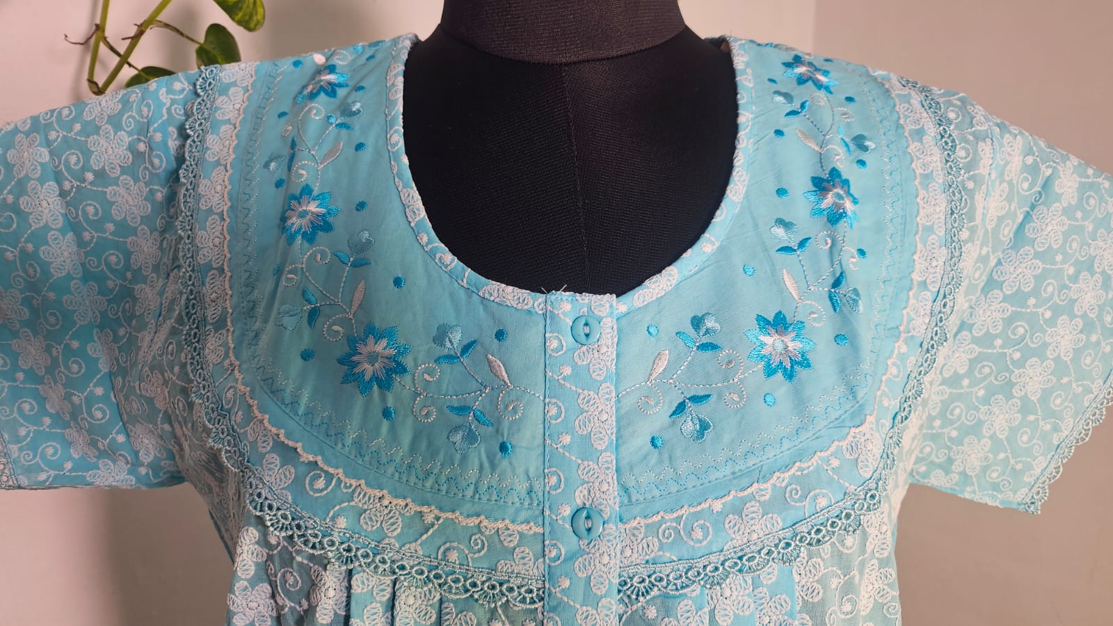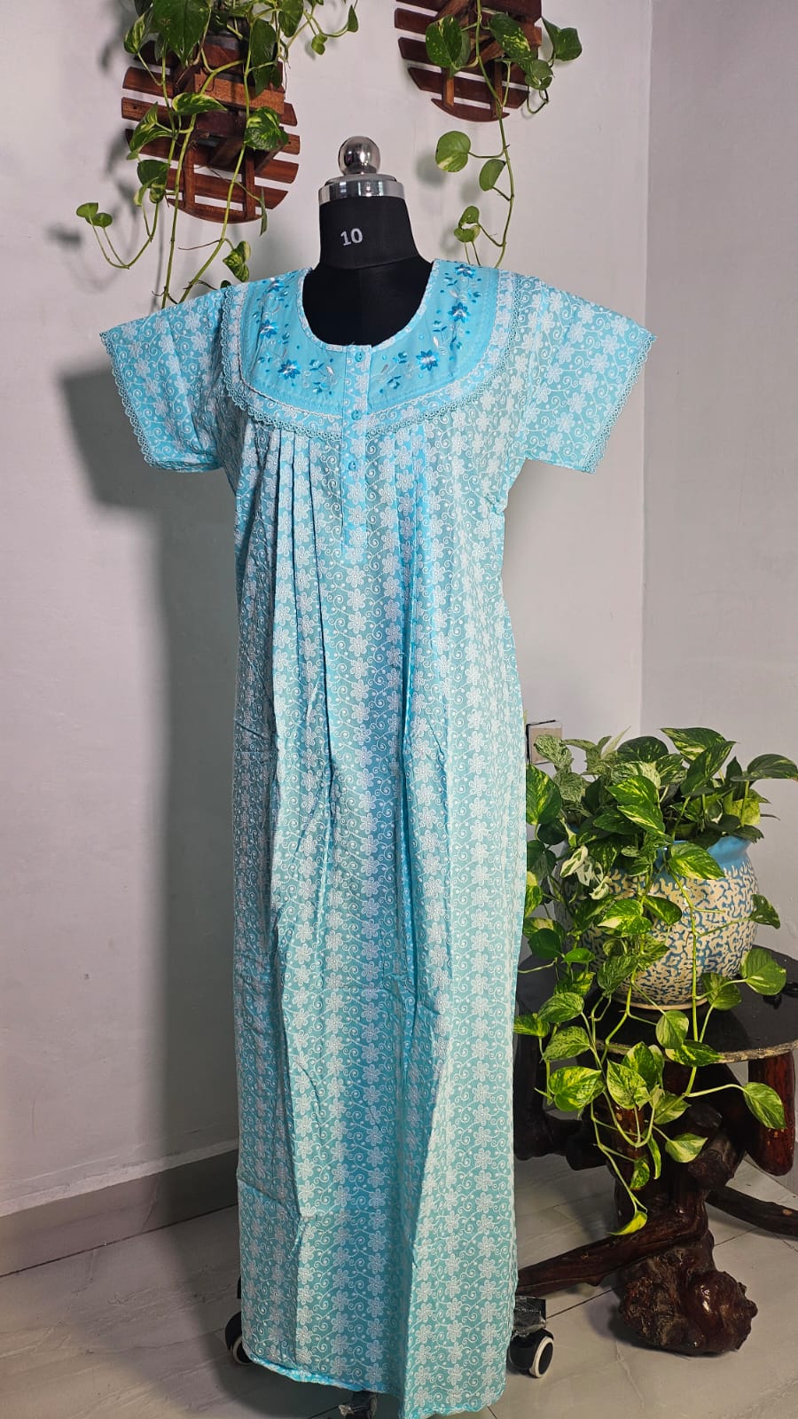 ऑफ-व्हाइट आर्किड किस के साथ मैजेंटा पुष्प प्रिंट फ्रिल्ड नाइटी।