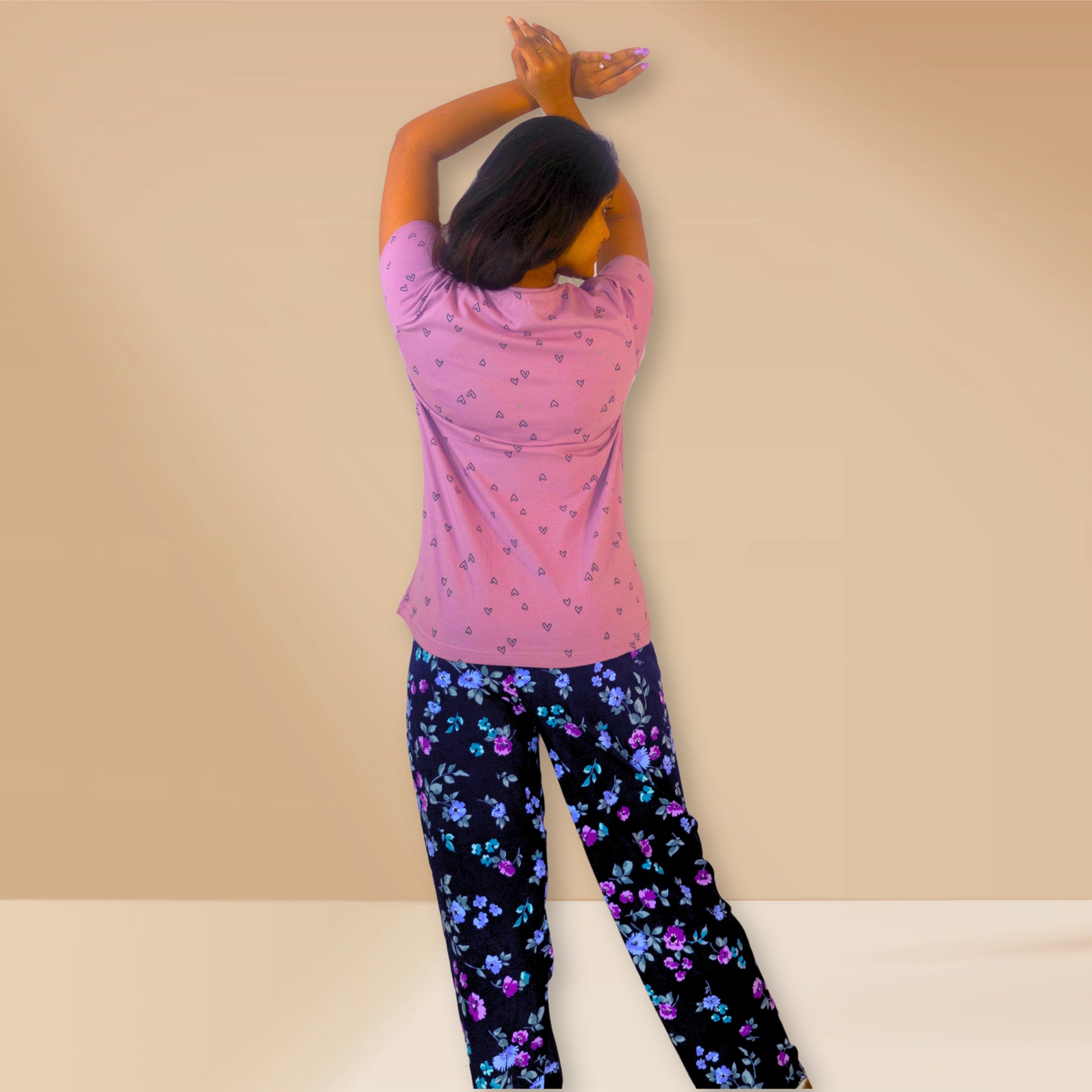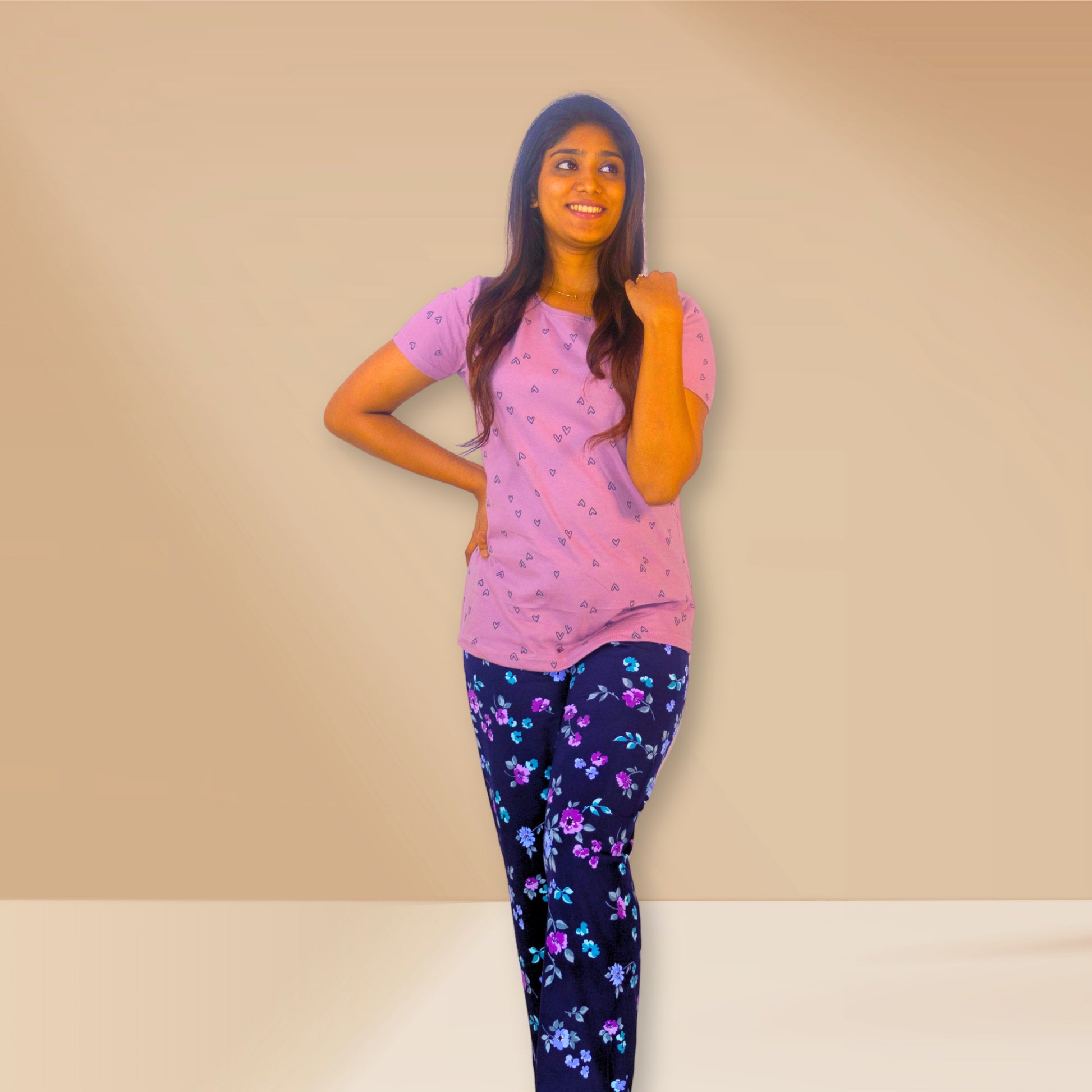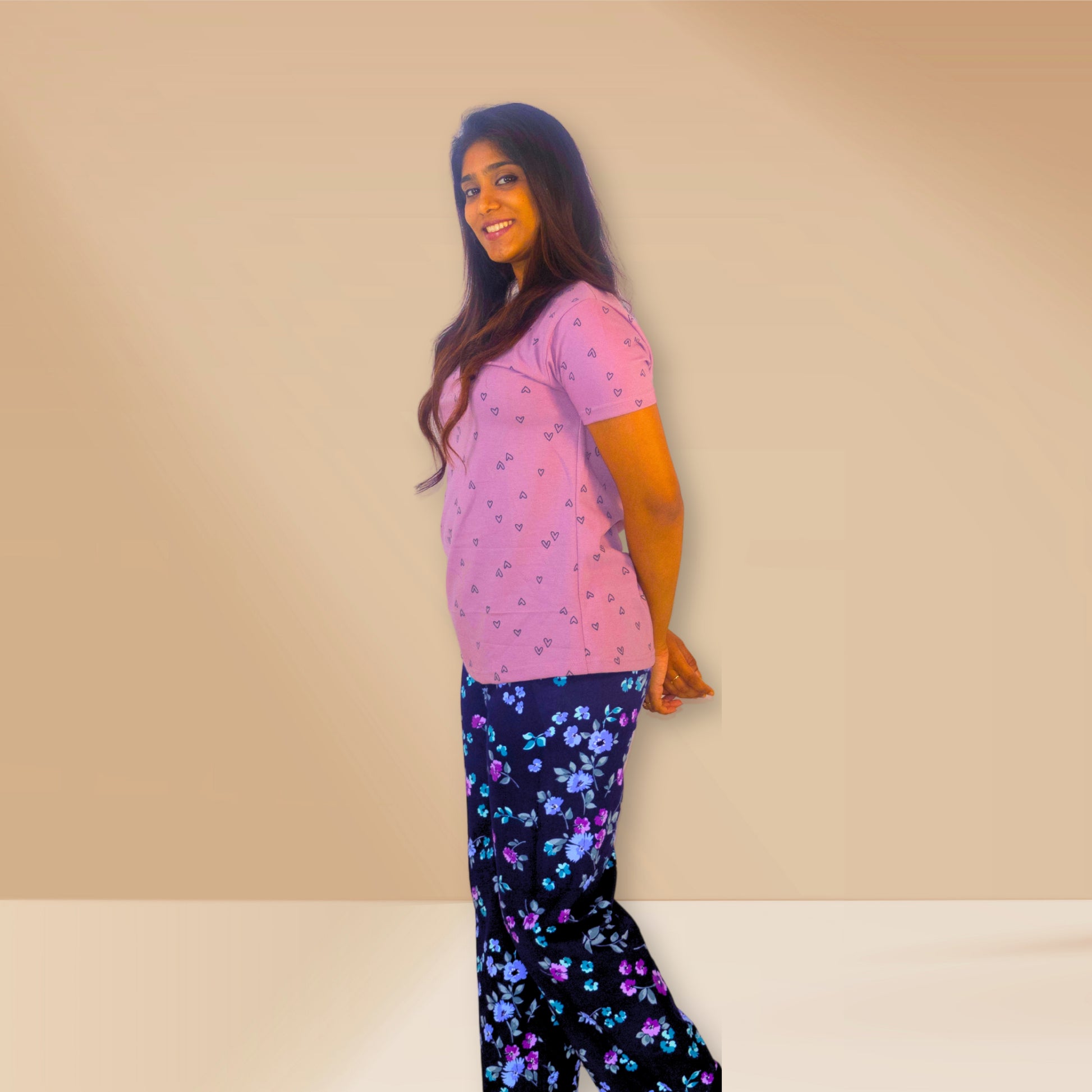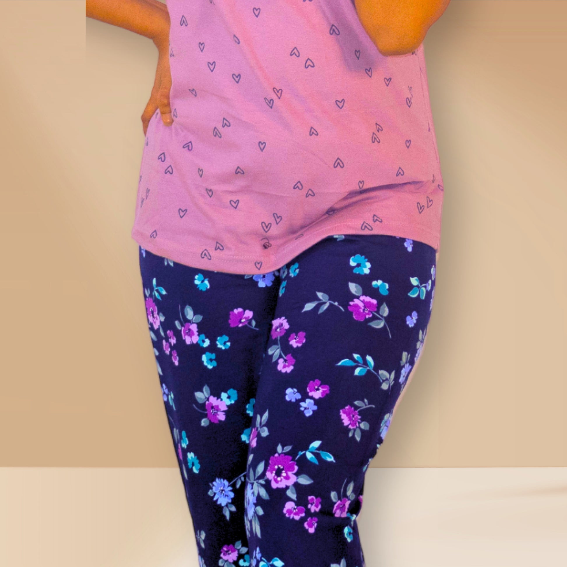 टस्कनी रंग, दिल के प्रिंट और नीले पुष्प वाली M&M नाइट ड्रेस