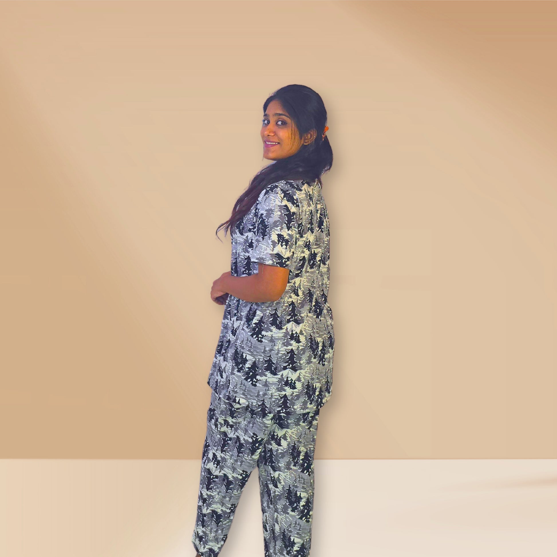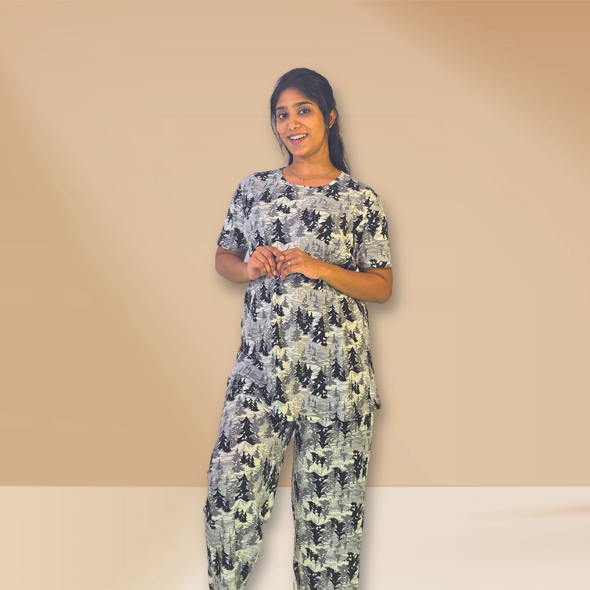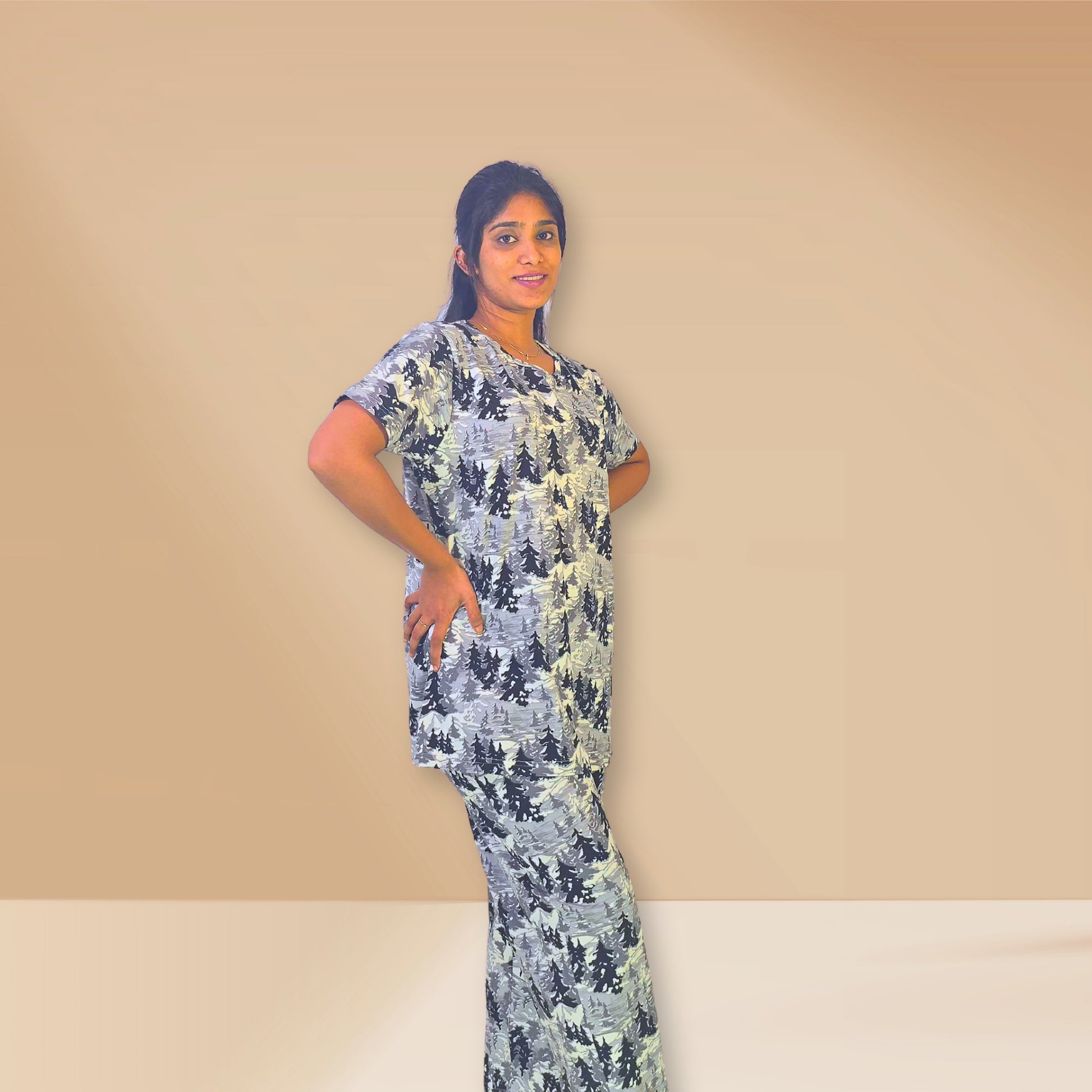 ट्री प्रिंट के साथ सफ़ेद और ग्रे को-ऑर्ड सेट नाइट ड्रेस