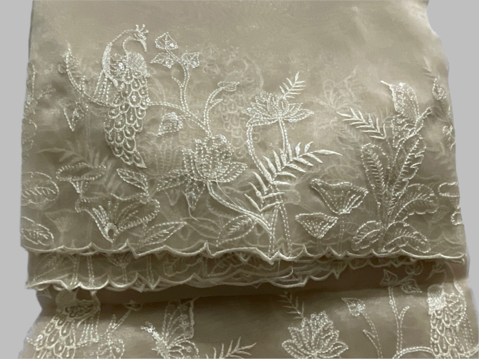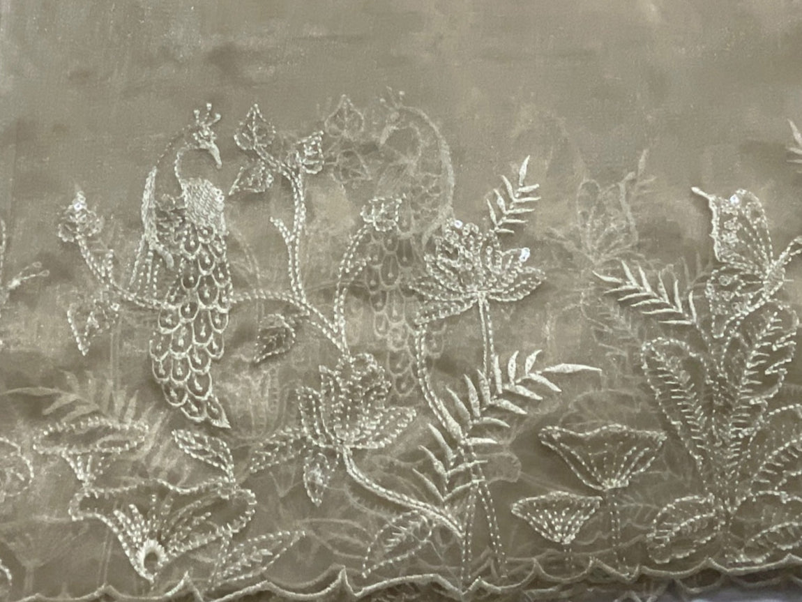 Drape yourself in sheer elegance with this exquisite embroidered organza saree. Adorned with intricate floral and peacock motifs, this saree is perfect for weddings, festive occasions, and special gatherings. The delicate embroidery on the soft organza fabric adds a touch of sophistication and grace, making you stand out effortlessly.