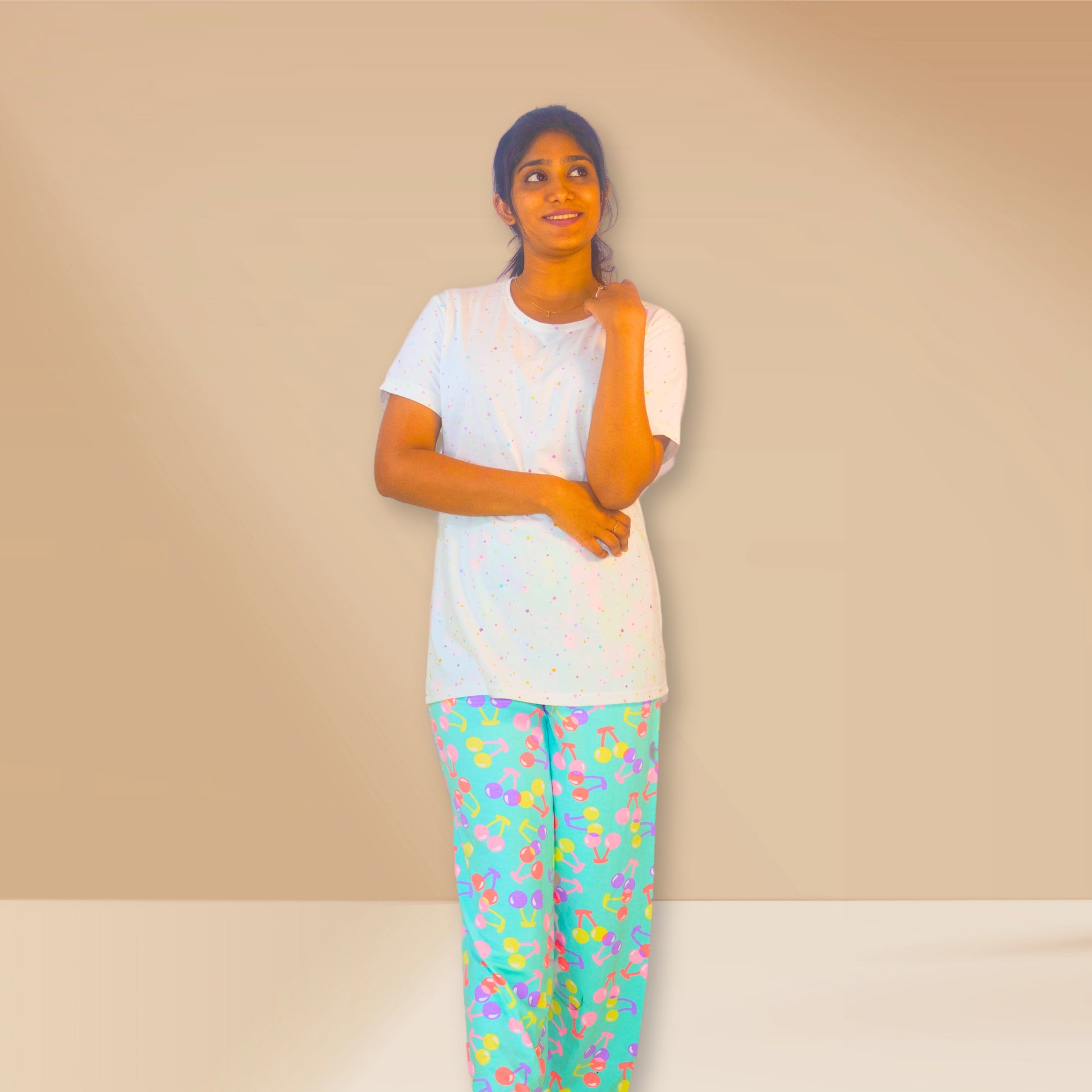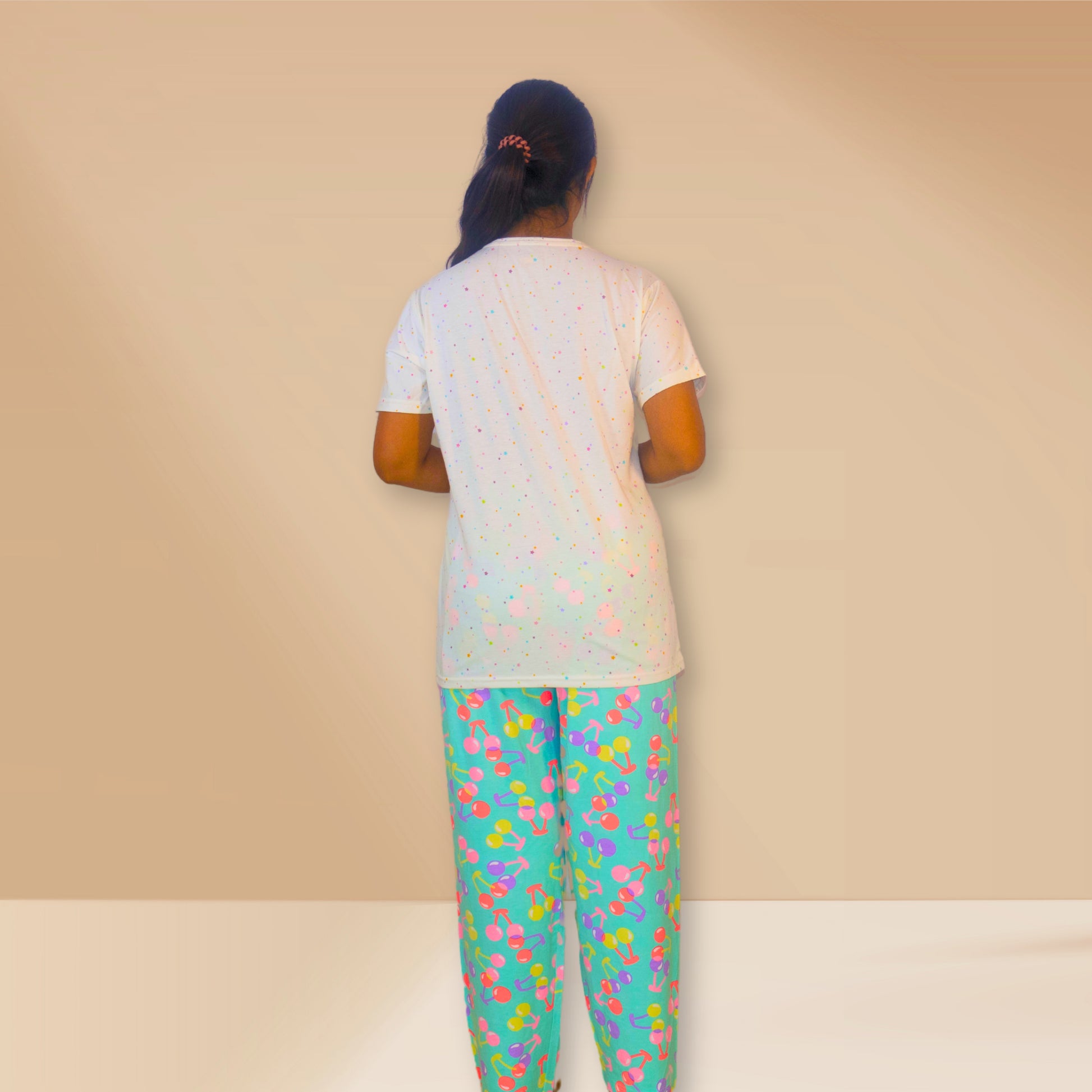 White and Edgewater green with multi-colour stars and balloon prints M&M Night dress